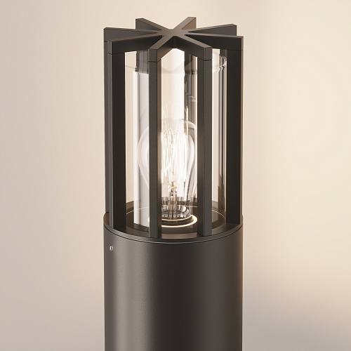 Металлический корпус, цвет - графит. Плафон из прозрачного стекла защищен декоративной металлической решеткой. Источник света — лампа с цоколем Е27. Степень защиты от пыли и влаги - IP54.