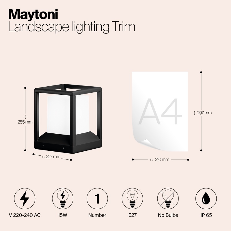 Алюминиевый корпус, цвет - графит. Белый акриловый рассеиватель. Источник света - лампа с цоколем Е27. Высокая степень защиты - IP65. Идеальная подсветка для заборов и различных колонн.
