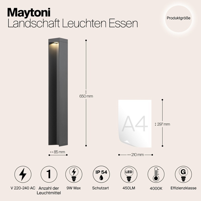Материал корпуса — алюминий, оттенки — черный, серый. IP 54. Защита от коррозии и перепадов температур. Источник света — LED-модуль с цветовой температурой 4000 К. Минималистичный дизайн. Серия представлена ландшафтными светильниками различной высоты.