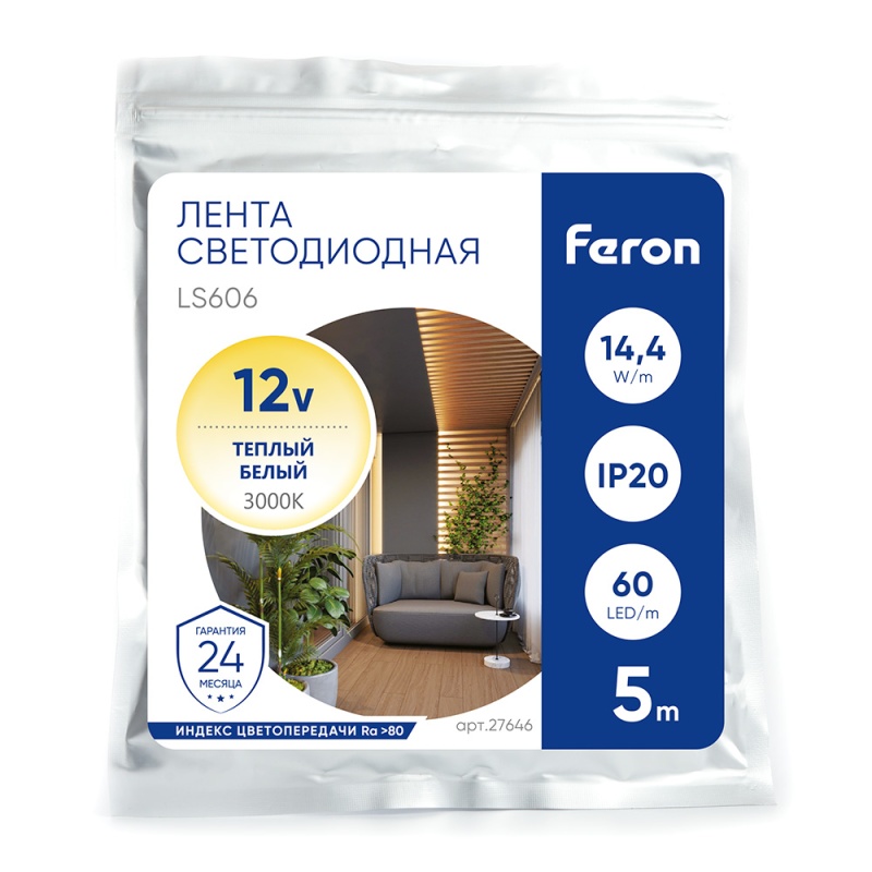 Характеристики Светодиодная LED лента Feron LS606, 60SMD(5050)/m 14.4W/m 12V 5m 3000К