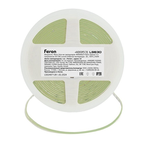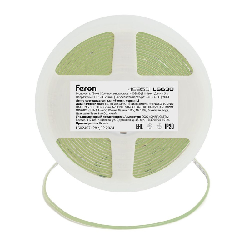 Характеристики Светодиодная COB лента Feron LS630, 400SMD(2110)/ 7Вт/м 12V 5000*3*1.8мм синий, IP20