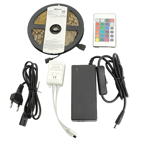 Светодиодная LED лента Feron LS606, 60SMD(5050)/m 14.4W/m 12V 3m RGB с адаптером с вилкой, контроллером с пультом в комплекте