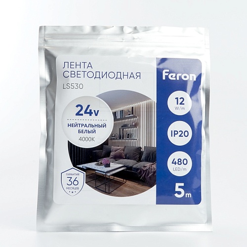 Отзывы о Светодиодная COB лента Feron LS530, 480SMD(2110)/м 12Вт/м 24V 5000*10*1.8мм 4000К IP20