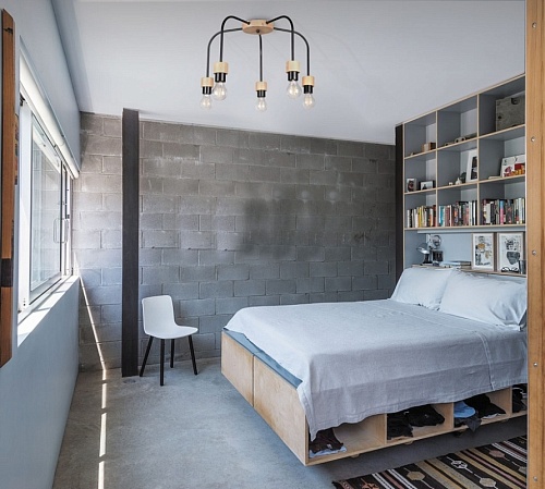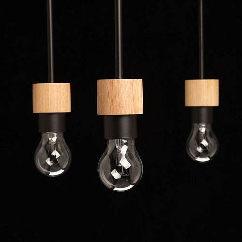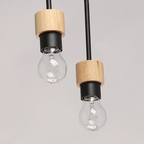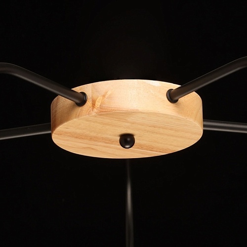 Металлическое основание потолочной люстры окрашено в черный цвет. Люстра декорирована элементами из натурального дерева.