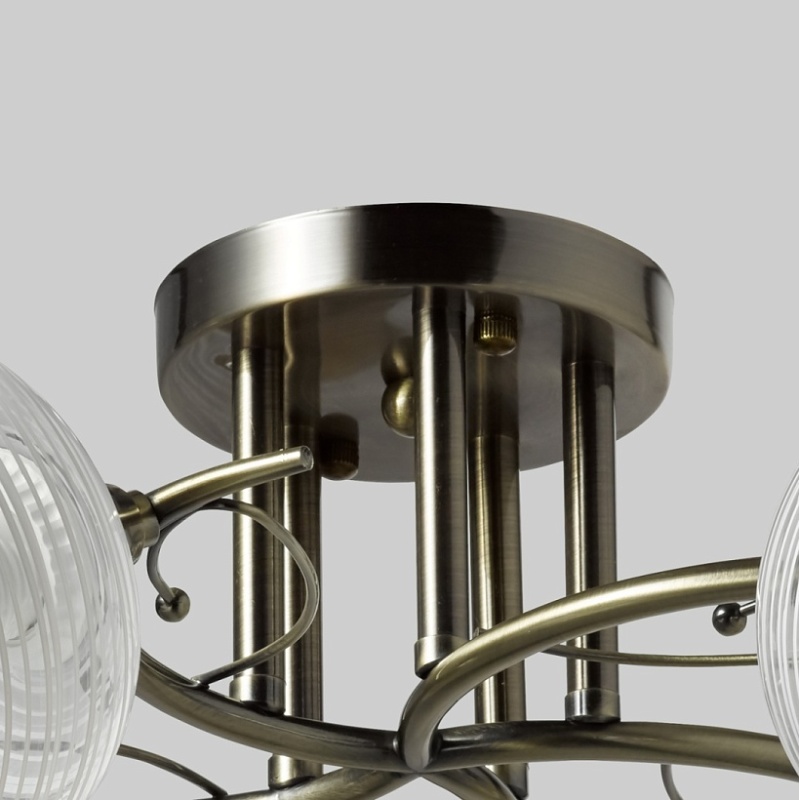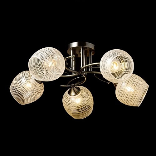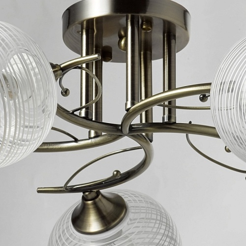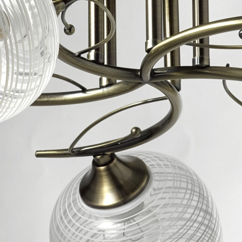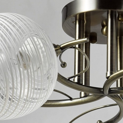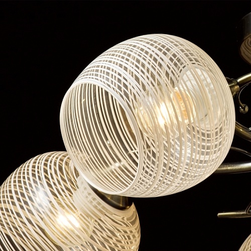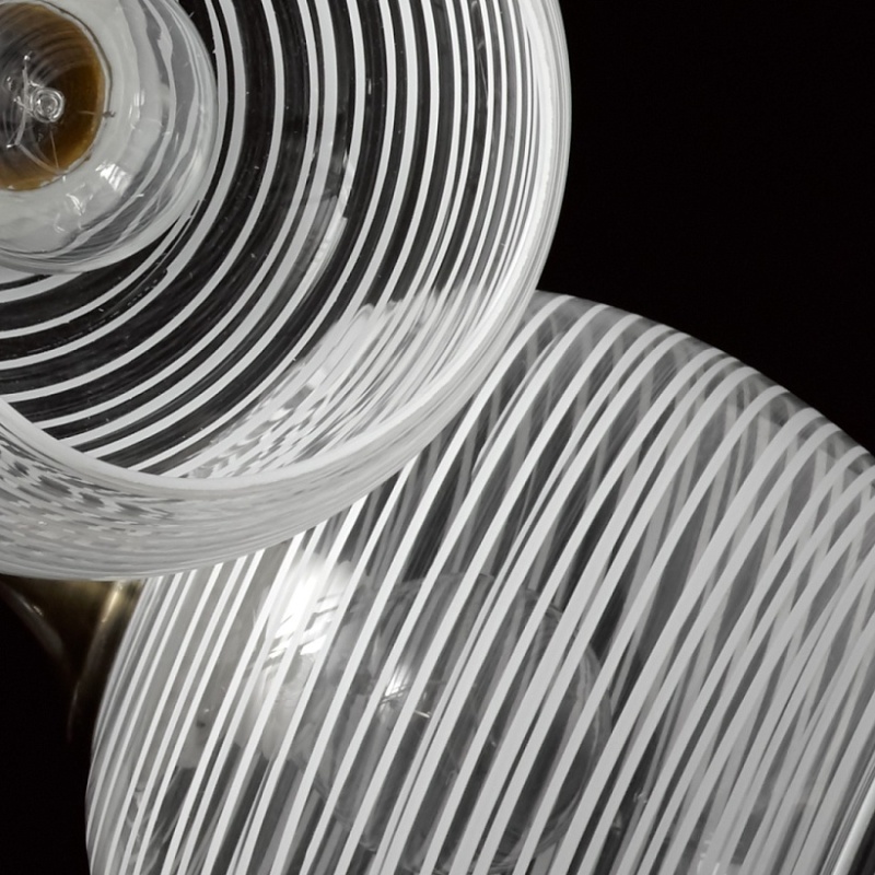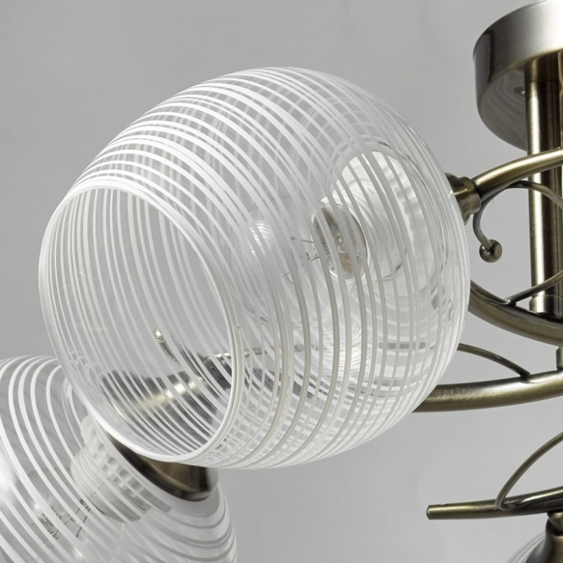 Основание светильника выполнено из металла и гальванизировано в цвет античной бронзы. Стеклянные плафоны окрашены белой краской в тонкую полоску. Края плафонов оплавлены.