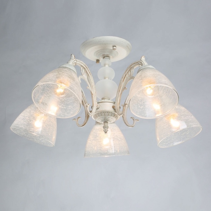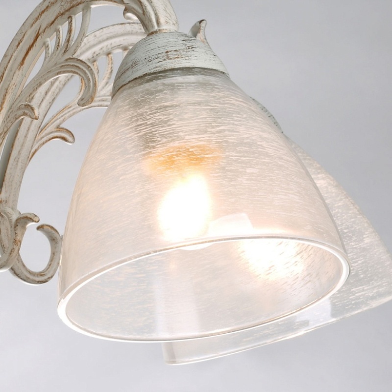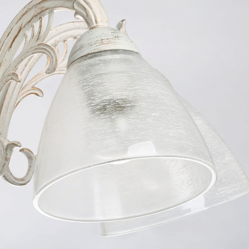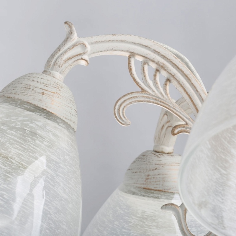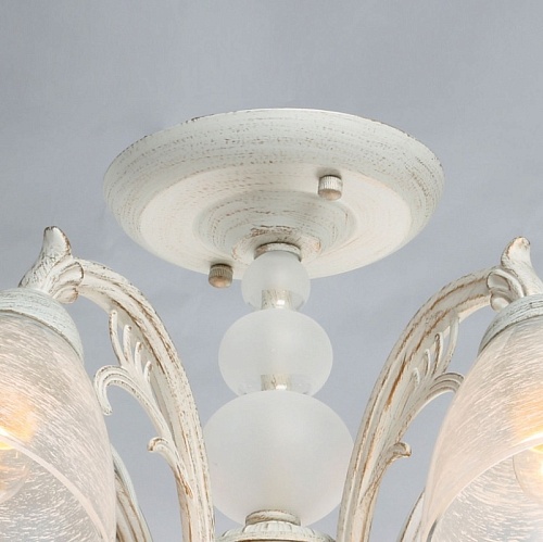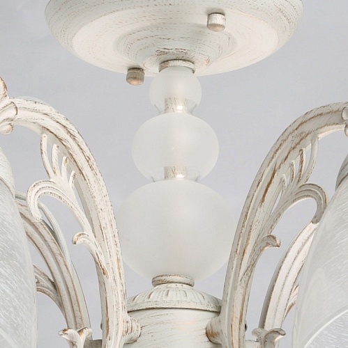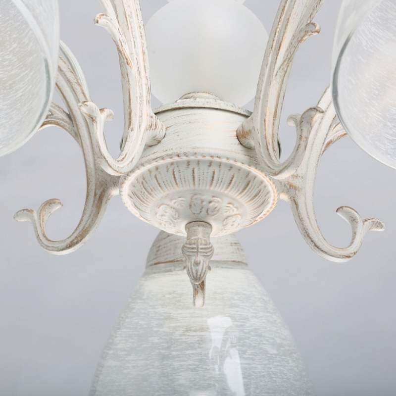 Металлическое основание потолочного светильника выполнено из металла и обработано по технологии хай-лайт, где основной слой белого цвета и декоративный слой золотого цвета. Рожки выполнены из сплава алюминия с цинком по технологии художественного литья. Стеклянные плафоны отлиты в форму и хаотично окрашены в белый цвет. Штанга светильника декорирована матированным стеклом ручной работы.