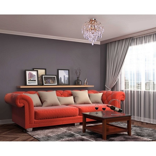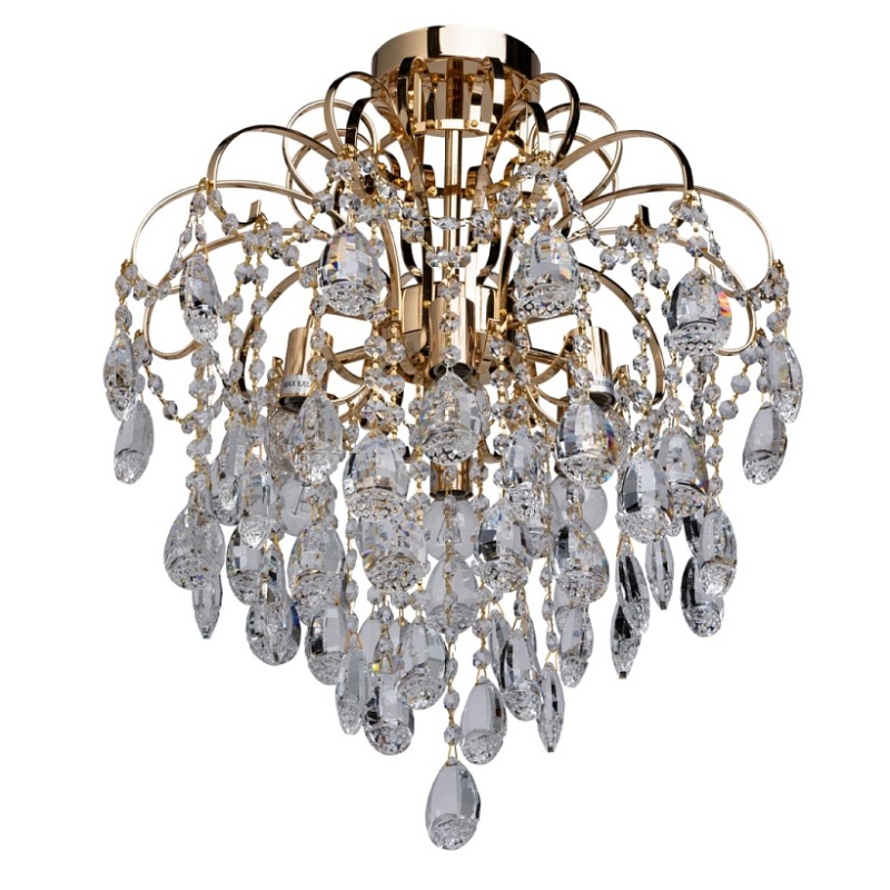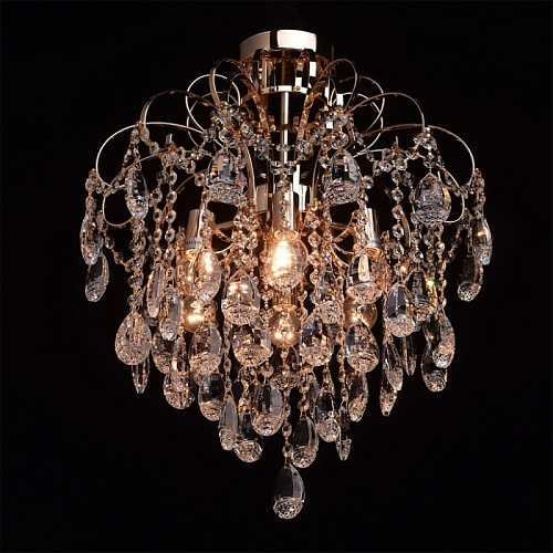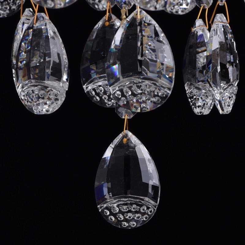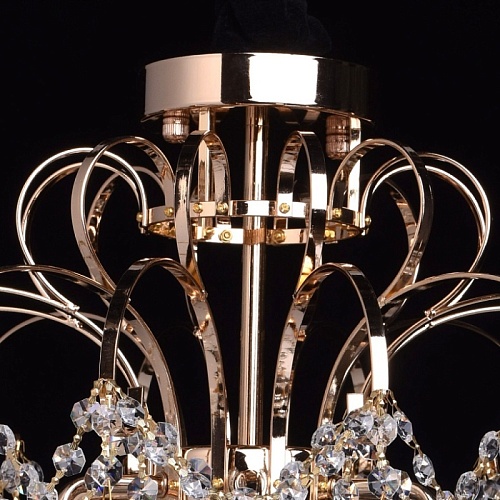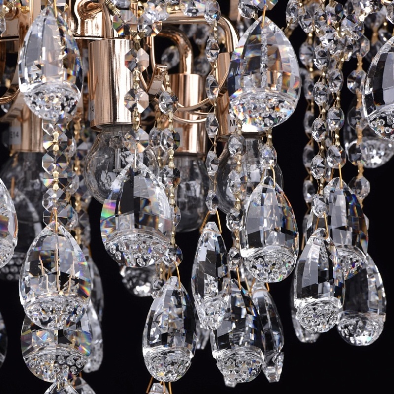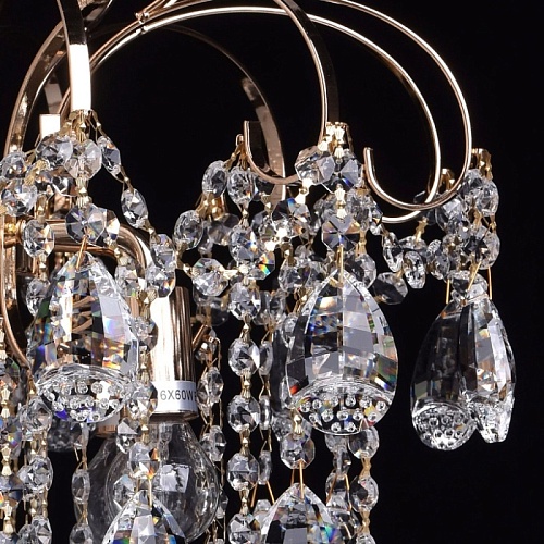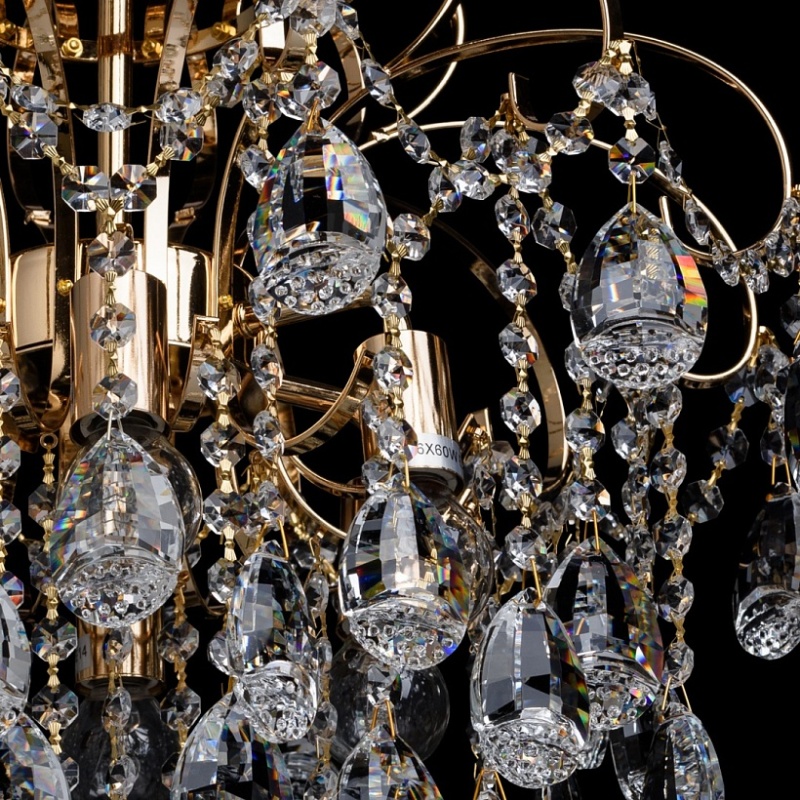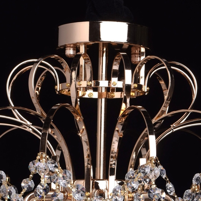 Основание светильника выполнено из металла и гальванизировано в цвет золота. Светильник декорирован подвесками из прозрачного хрустального стекла миндалевидной формы и формы октагона.