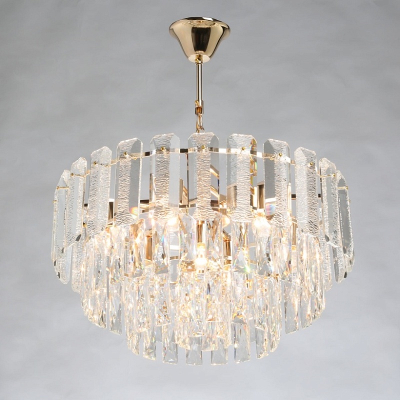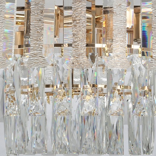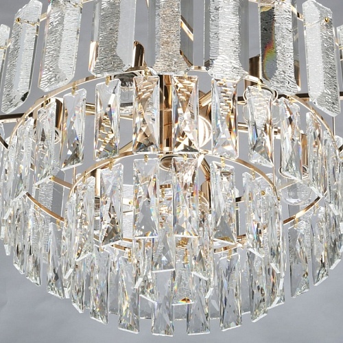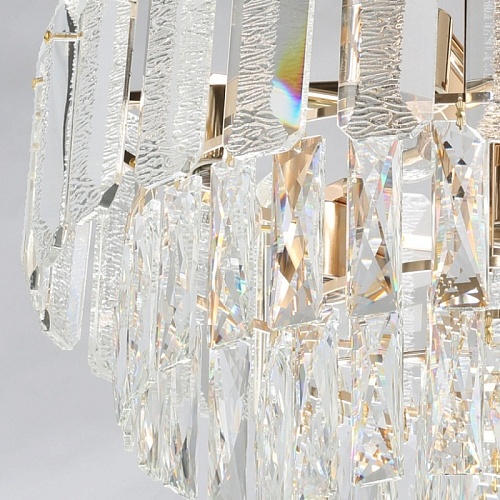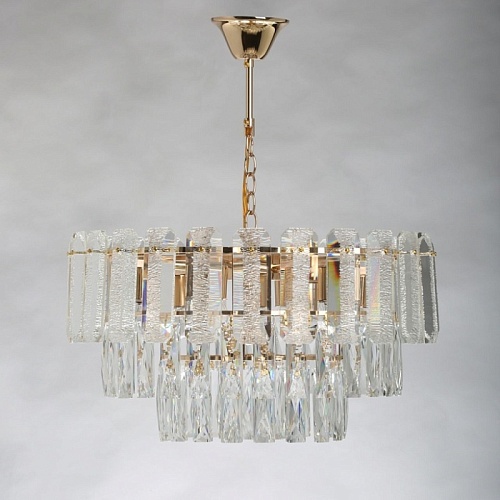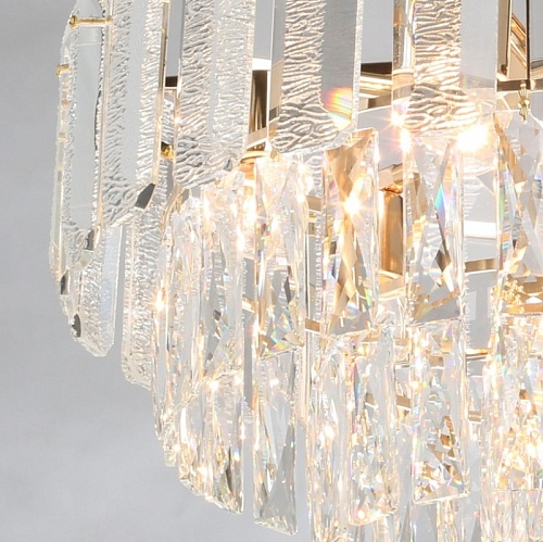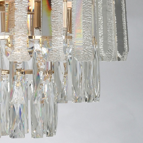 Металлическое основание подвесного светильника гальванизировано в цвет золота. Светильник декорирован прозрачным фактурным хрустальным стеклом и хрусталем вытянутой формы.