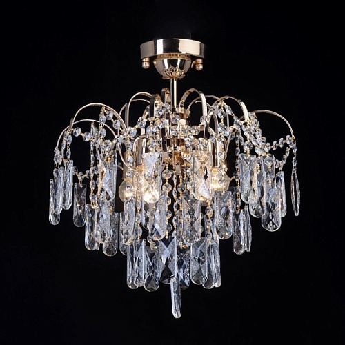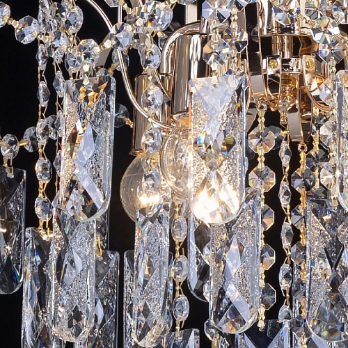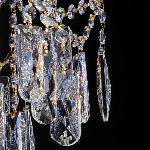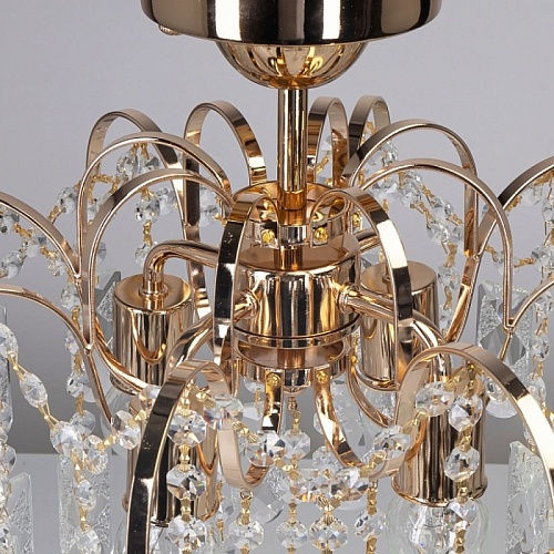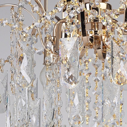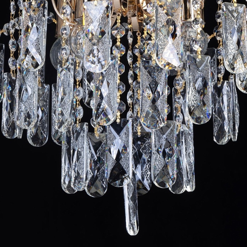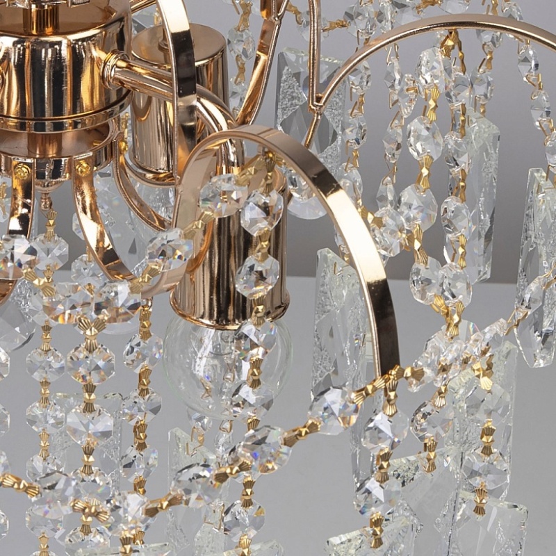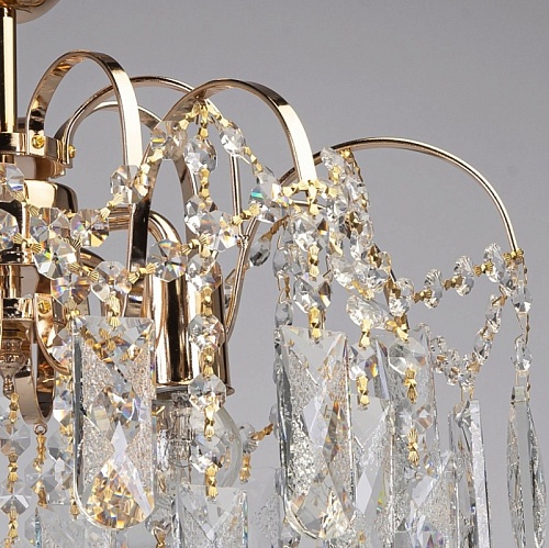 Металлическое основание светильника гальванизировано в цвет золота. Подвесная люстра декорирована прозрачным хрусталем.
