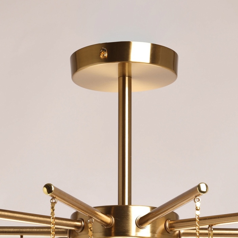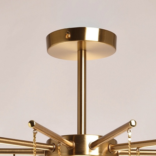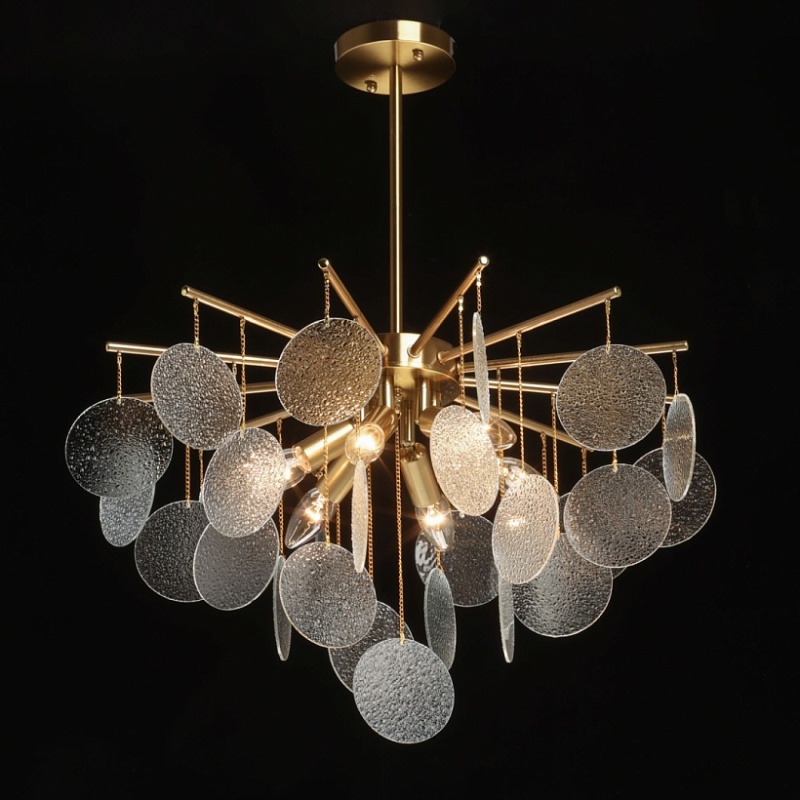 Металлическое основание подвесной люстры гальванизировано в цвет латуни. Люстра декорирована подвесками из фактурного полупрозрачного стекла.
