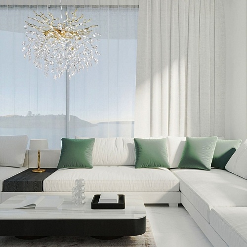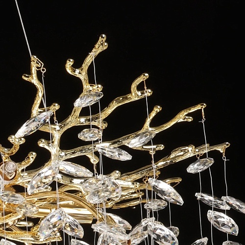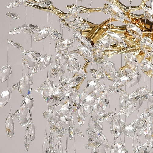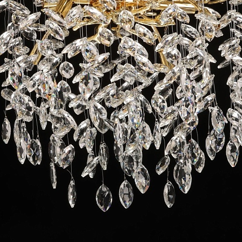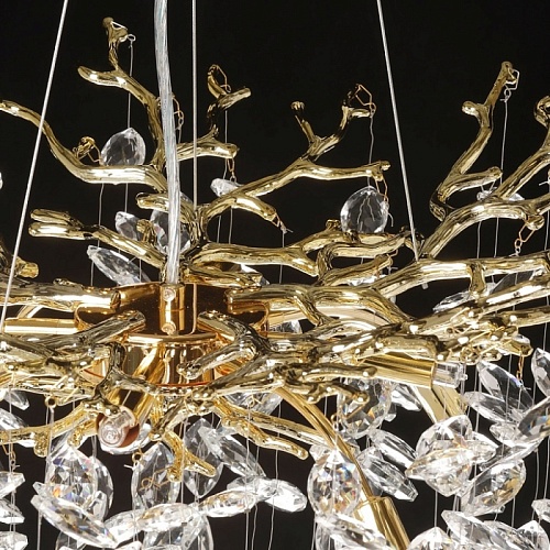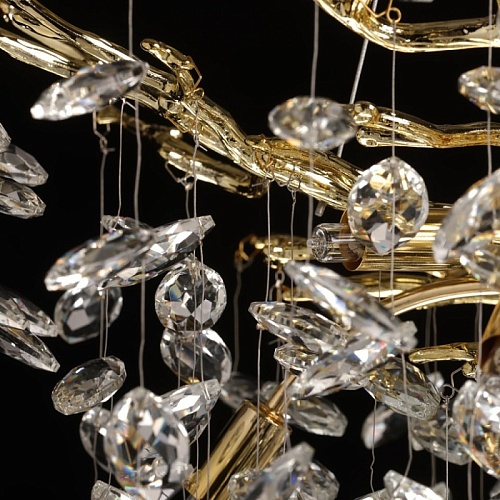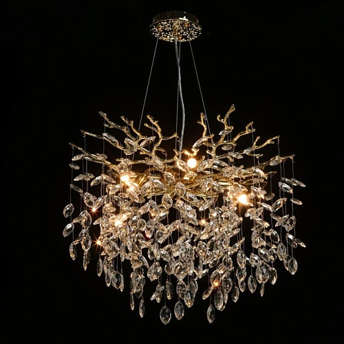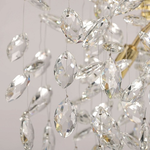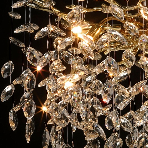 Основание подвесной люстры выполнено по технологии художественного литья из сплава алюминия с цинком и гальванизировано в цвет золота. Люстра декорирована подвесками из прозрачного хрусталя.