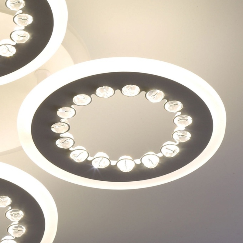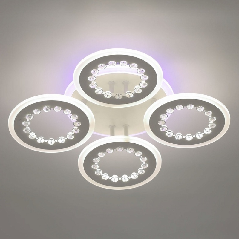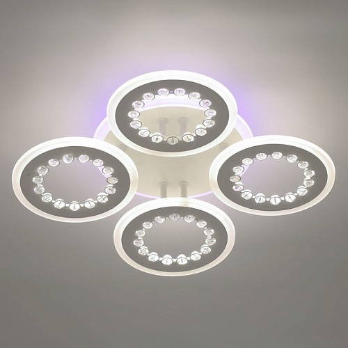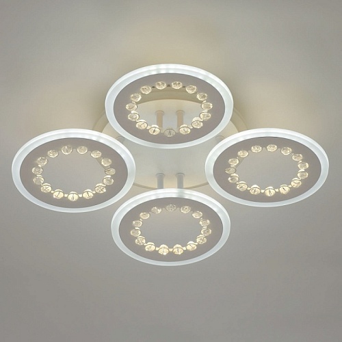 Металлическое основание и плафоны потолочной люстры окрашены в белый цвет. Светодиодные источники света закрыты белым матовым акрилом. Потолочная люстра декорирована бусинами из прозрачного акрила. Дополнительно, в светильнике предусмотрена подсветка потолочной чаши. Светильник приходит в состоянии частичной сборки в компактной упаковке: вся электрика подсоединена, достаточно закрепить плафоны на корпусе.