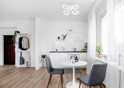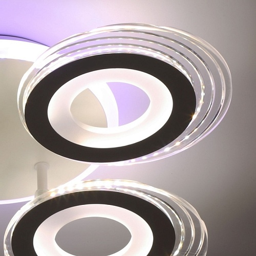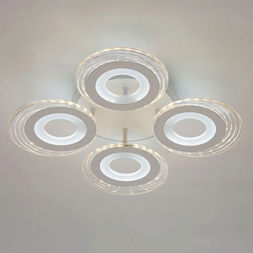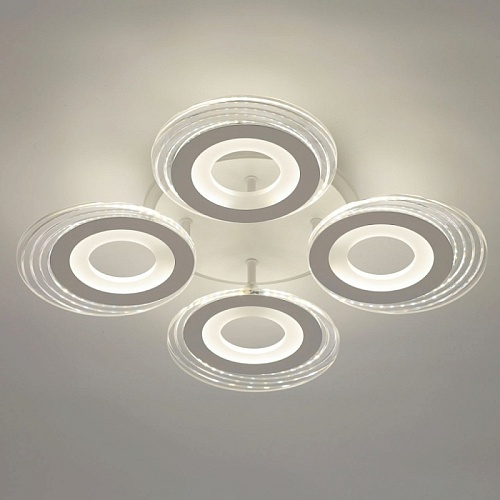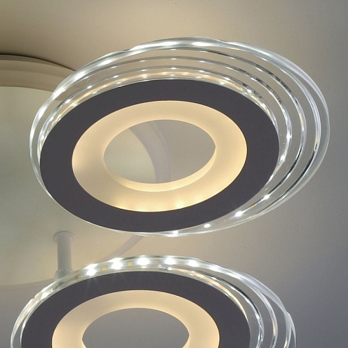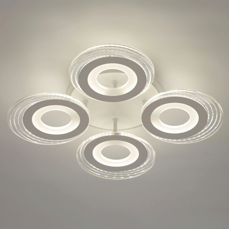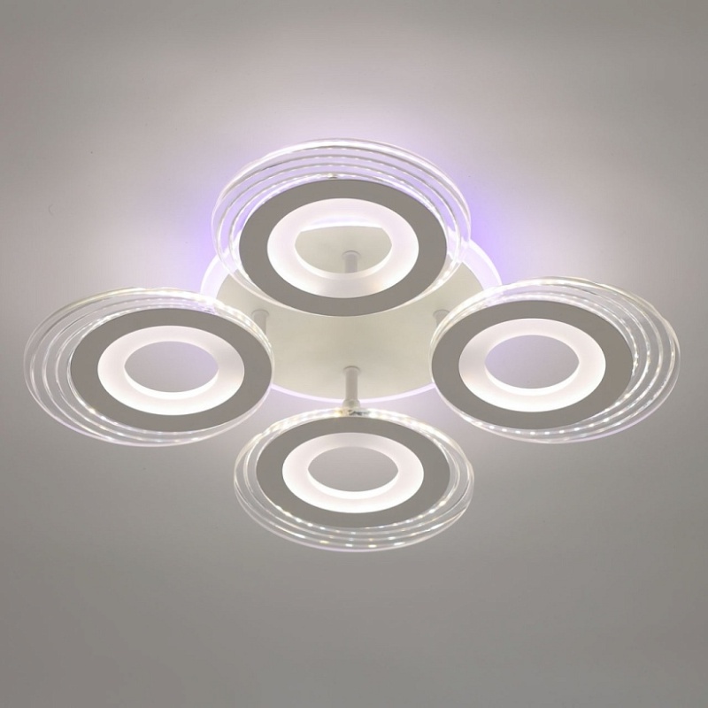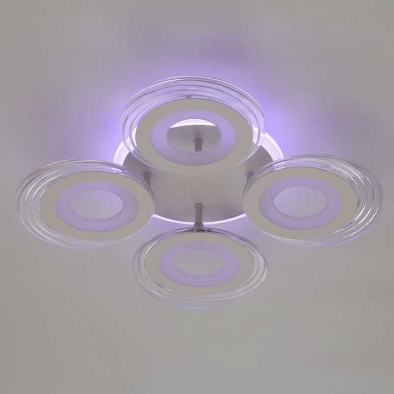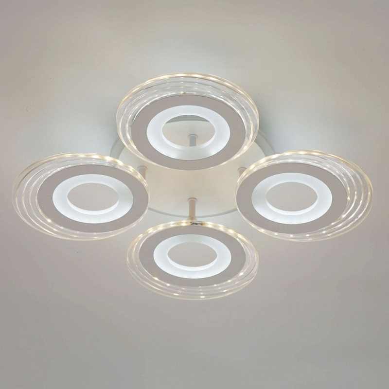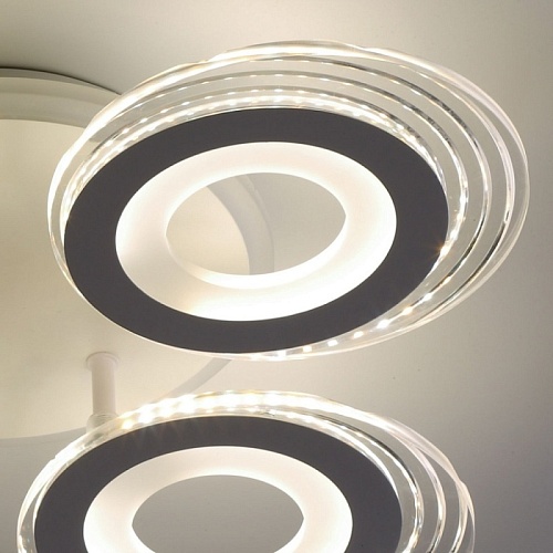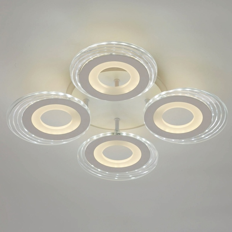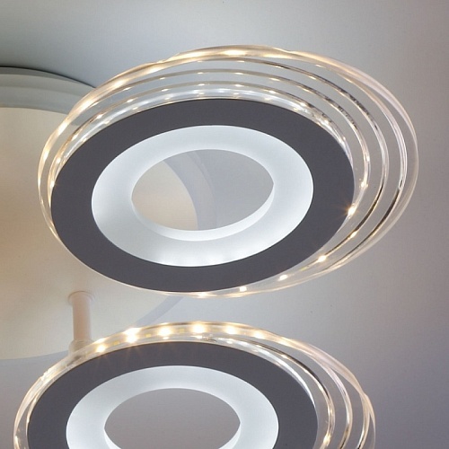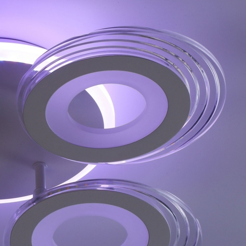 Металлическое основание светильника окрашено в белый цвет. Каркас плафона выполнен из сплава алюминия с цинком и окрашен в цвет основания. Светодиодные источники света закрыты белым матовым и прозрачным акрилом. Дополнительно, в светильнике предусмотрена подсветка потолочной чаши. Светильник приходит в состоянии частичной сборки в компактной упаковке: вся электрика подсоединена, достаточно закрепить плафоны на корпусе.