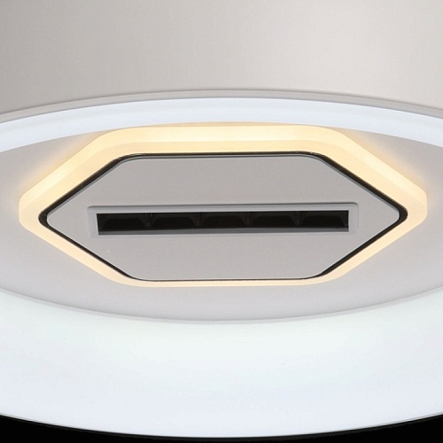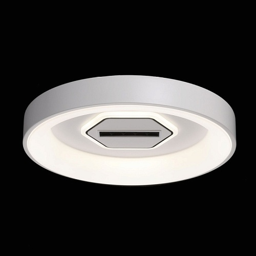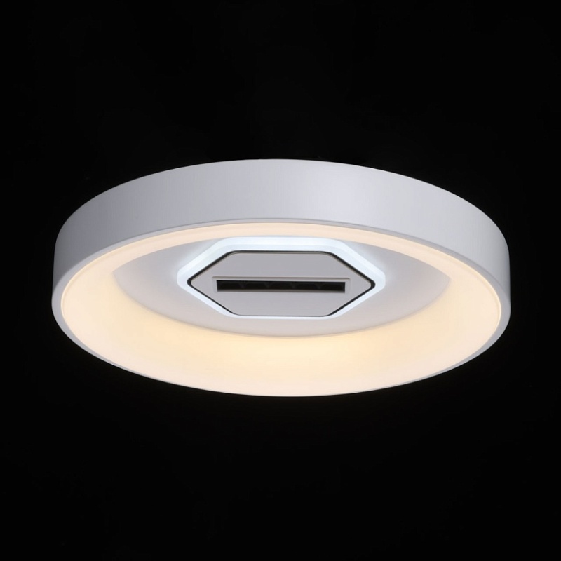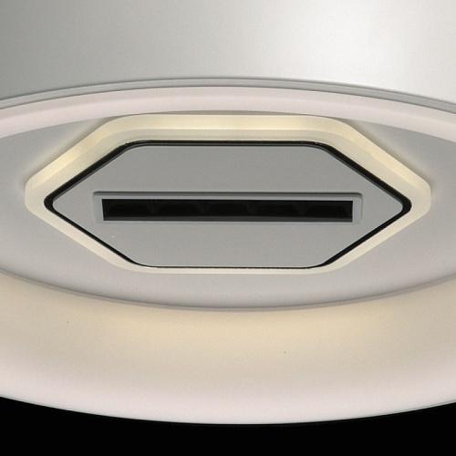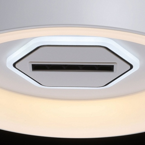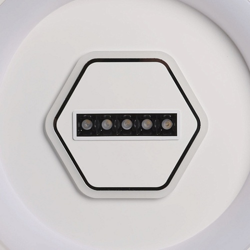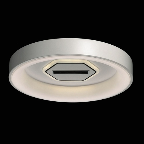 Металлическое основание светильника окрашено в белый цвет. Светодиодные источники света закрыты белым матовым акрилом. В центр светильника, выделенного металлическим кантом, гальванизированным в цвет хрома, на пластине из сплава алюминия, окрашенной в металлический цвет, встроены 5 светодиодов функционального освещения. В комплект входит пульт.