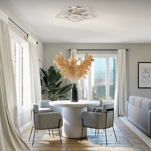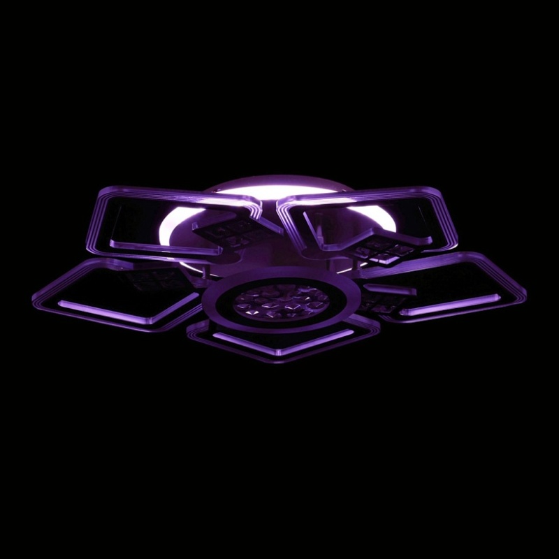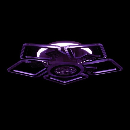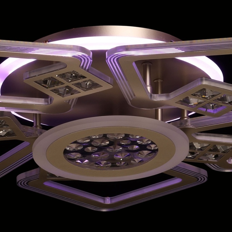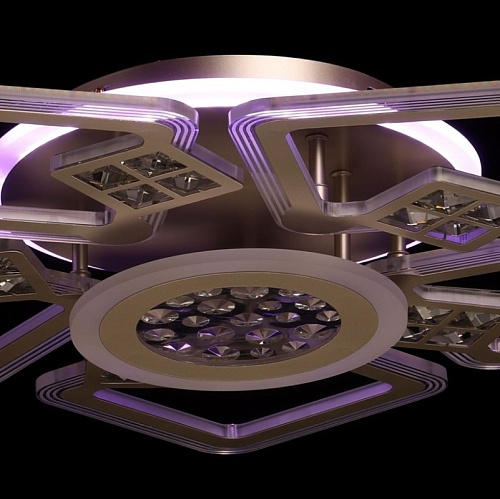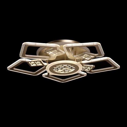 Металлическое основание потолочной люстры окрашено в цвет перламутрового золота. Корпус плафонов выполнен из сплава алюминия с цинком и окрашен в цвет основания. Светодиодные источники света закрыты белым матовым акрилом. Люстра декорирована элементами из прозрачного акрила.