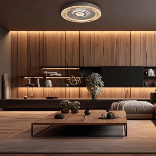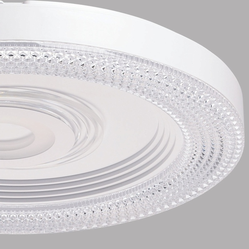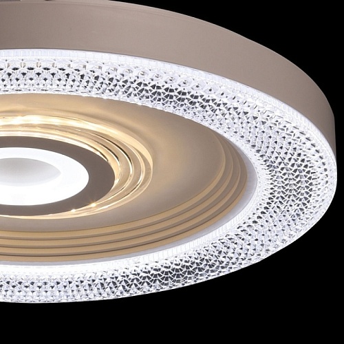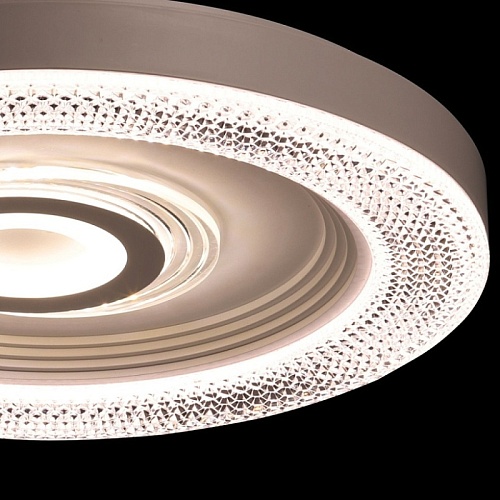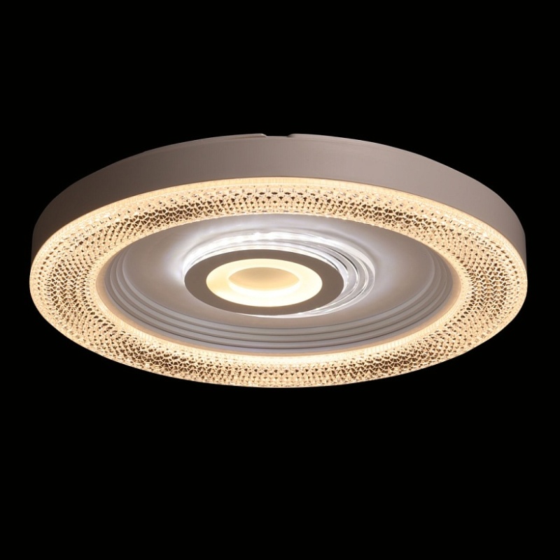 Металлическое основание потолочной люстры окрашено в белый цвет. Светодиодные источники света закрыты белым матовым и прозрачным акрилом.