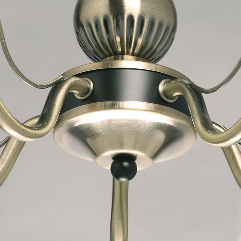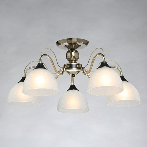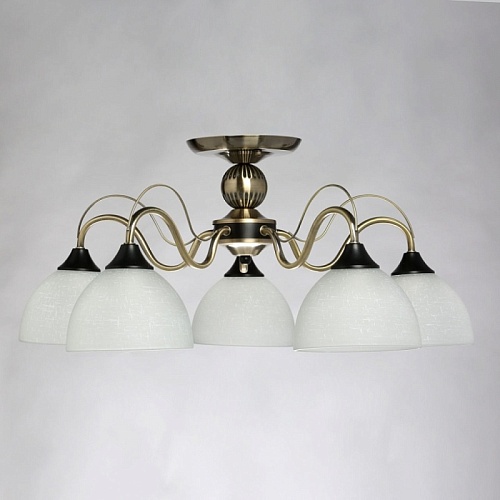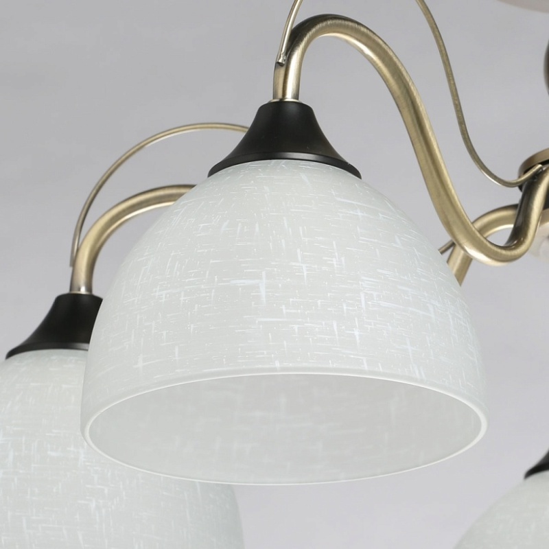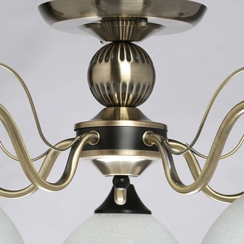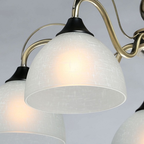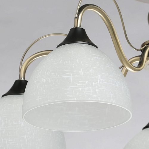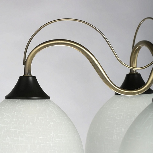 Металлическое основание гальванизировано в цвет античной бронзы. Отдельные элементы основания окрашены в черный цвет. Светильник декорирован стеклянными плафонами, отлитыми в форму. Плафоны матированы и окрашены вручную. На плафоны белым цветом нанесен рисунок в виде паутинки.