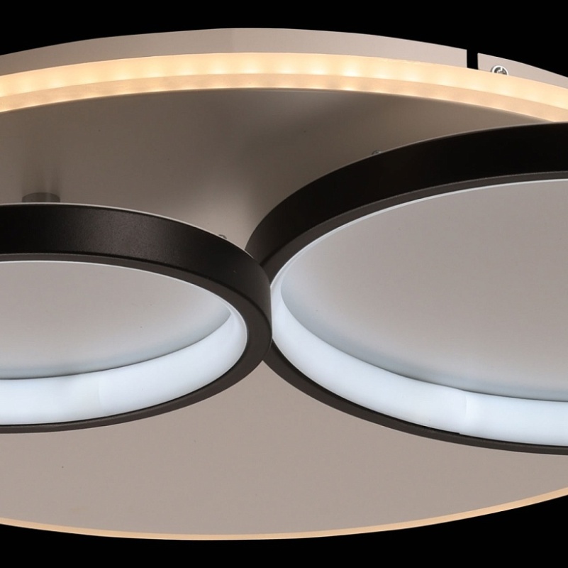 Металлическое основание потолочной люстры окрашено в белый цвет. Корпус плафона выполнен из сплава алюминия с цинком и окрашен в черный цвет. Светодиодные источники света на основании закрыты матовым акрилом, на плафоне - силиконом белого цвета. Плафоны крепятся на шарнирах и поворачиваются в горизонтальной плоскости.