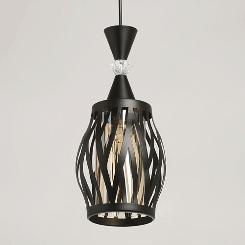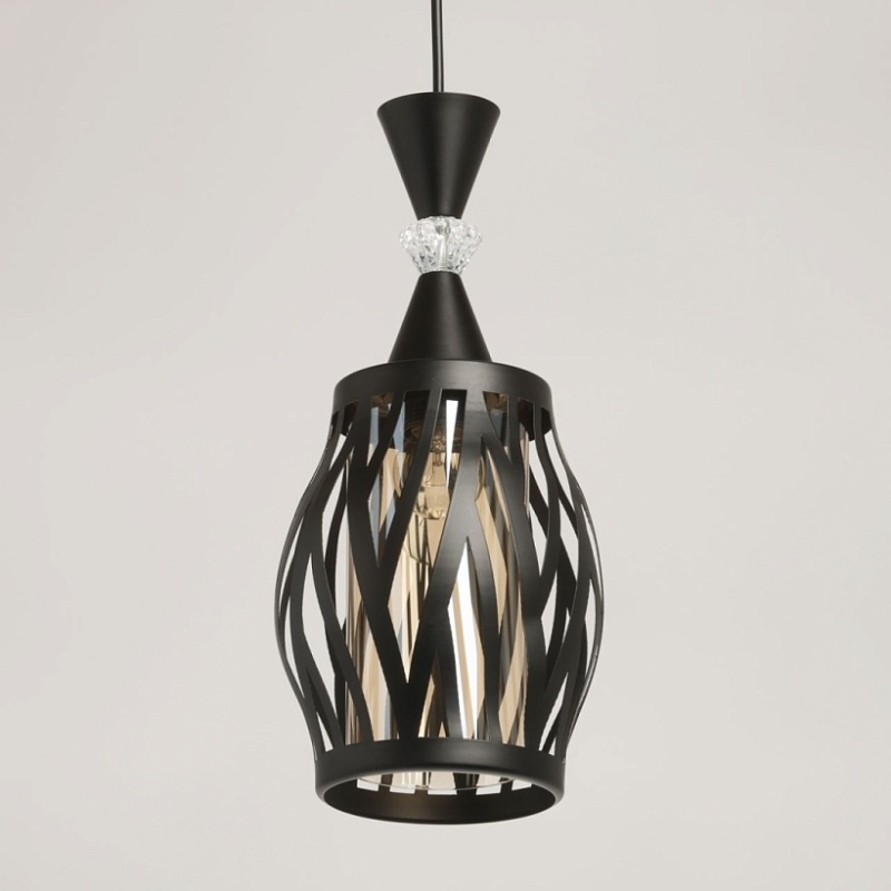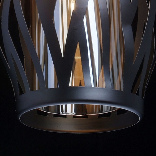 Металлическое основание подвеса окрашено в черный цвет. Источник света закрыт двойным плафоном. Внешний фигурный плафон выполнен из металла и окрашен в цвет основания. Внутренний плафон отлит из стекла, гальванизированного в цвет шампань. Подвес декорирован элементом из прозрачного стекла
