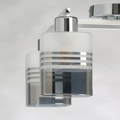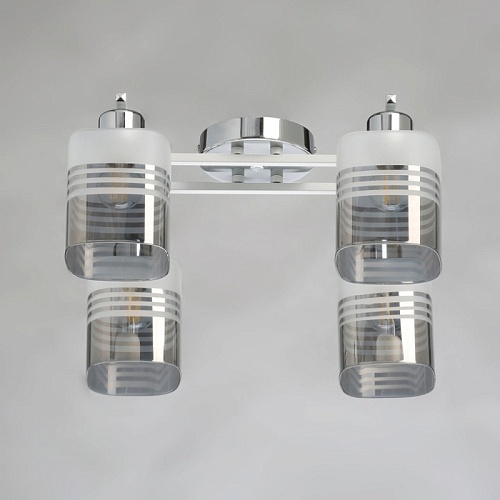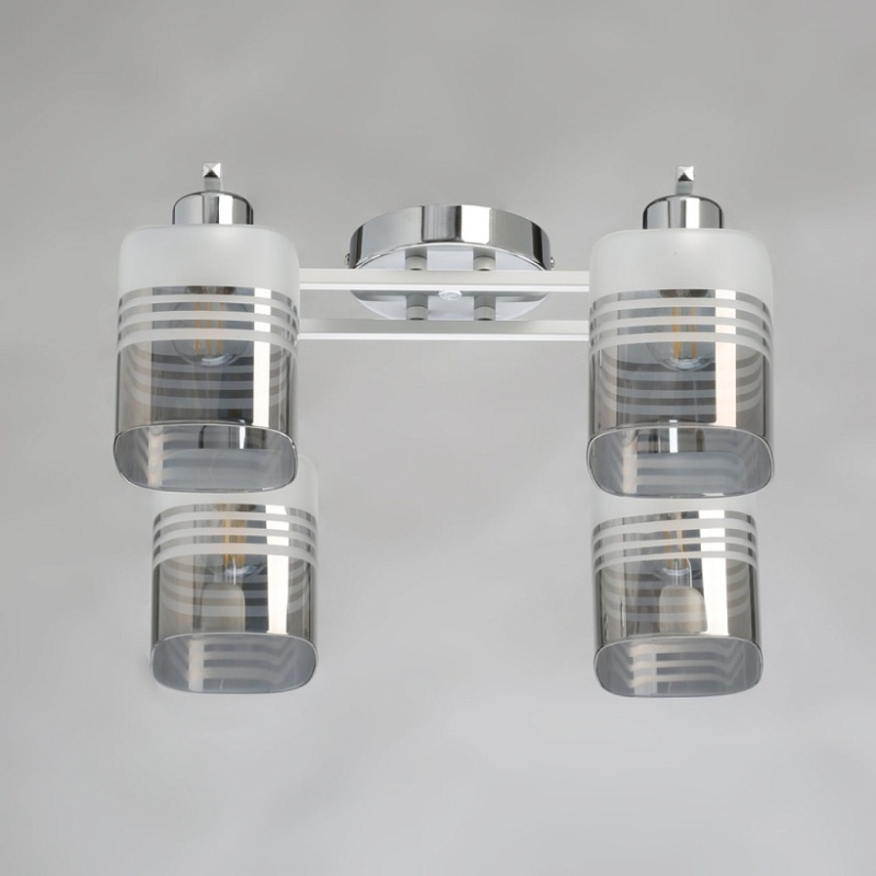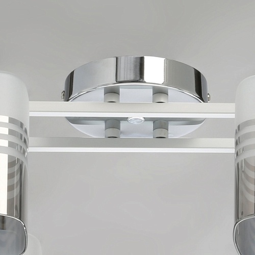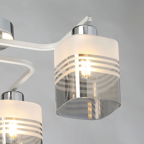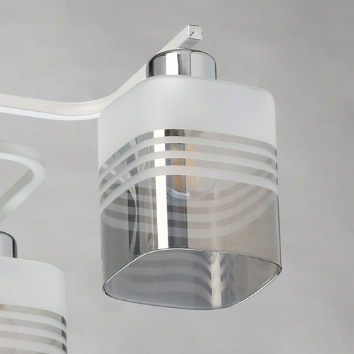 Металлическое основание потолочного светильника окрашено в белый цвет. Отдельные элементы гальванизированы в цвет хрома. Стеклянные плафоны гальванизированы в дымчатый цвет и окрашены в белый цвет в виде параллельных полос