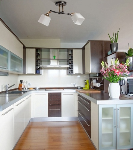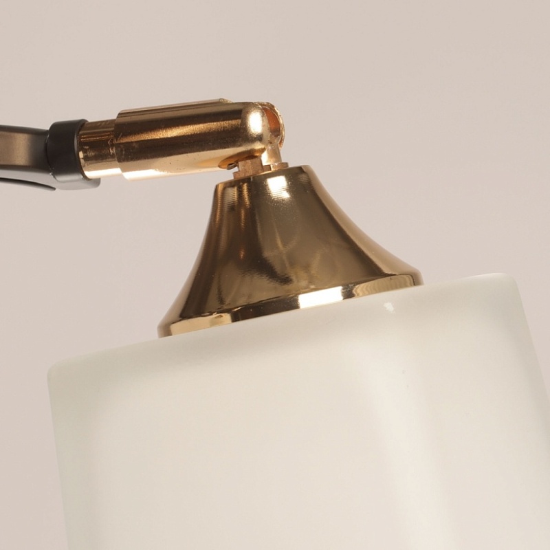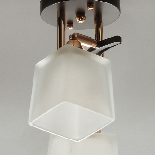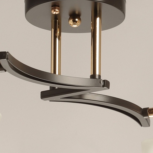 Металлическое основание потолочной люстры окрашено в цвет кофе. Отдельные элементы основания гальванизированы в цвет золота. Стеклянные плафоны отлиты в оригинальную форму и окрашены в белый цвет с внутренней стороны.