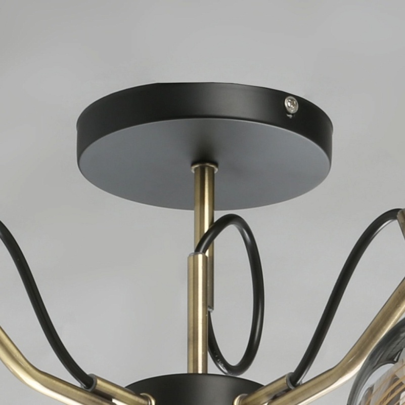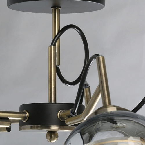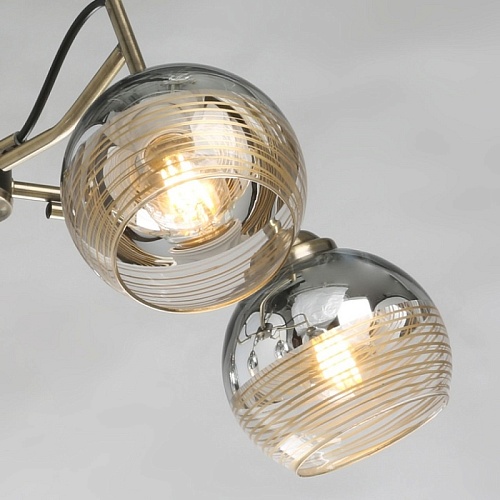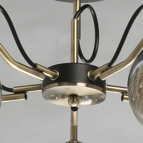 Металлическое основание потолочного светильника гальванизировано в цвет античной бронзы. Отдельные элементы окрашены в черный цвет. Светильник декорирован выдувными вручную стеклянными плафонами. У основания плафоны гальванизированы в цвет хрома. На прозрачную часть плафонов нанесен рисунок в виде параллельных полос цвета бронзы.