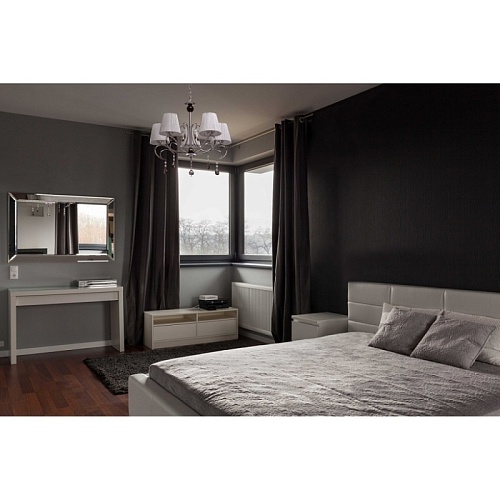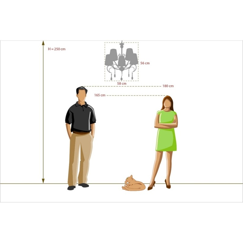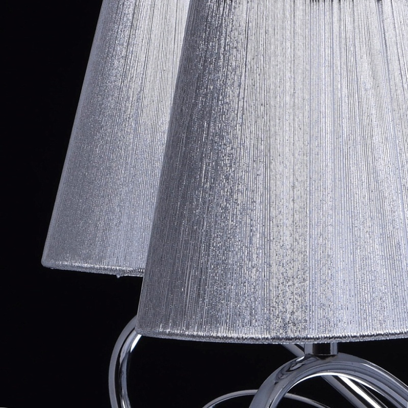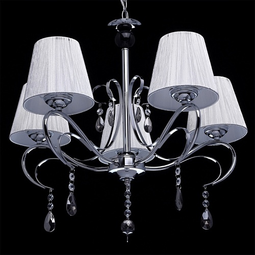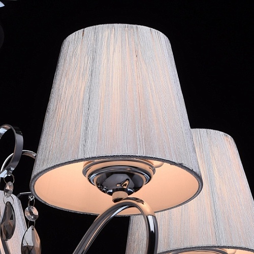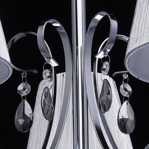 Основание светильника выполнено из металла и гальванизировано в цвет хрома. Рожки и декоративные элементы изящно изогнуты по технологии проката на роликовом станке. Центральный стержень светильника декорирован массивом из хрустального стекла, окрашенного в массе в черный цвет. Абажуры: выполнены из текстильных нитей стального цвета с термостойким акрилом внутри.Декор: подвески из прозрачного и гальванизированного в цвет антрацит декоративного стекла.