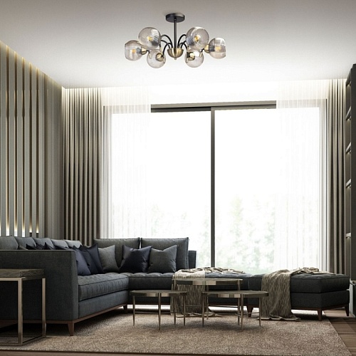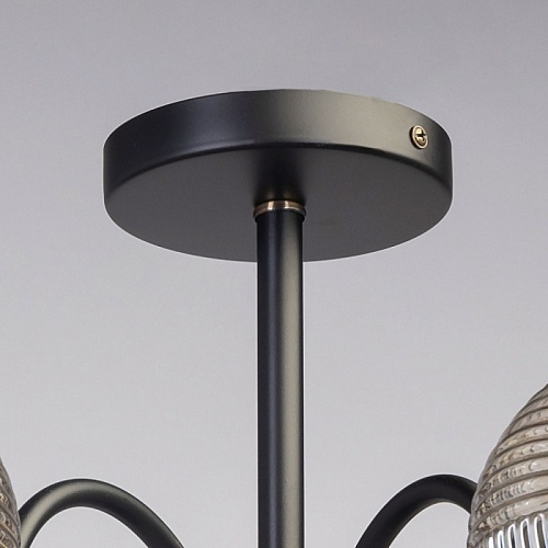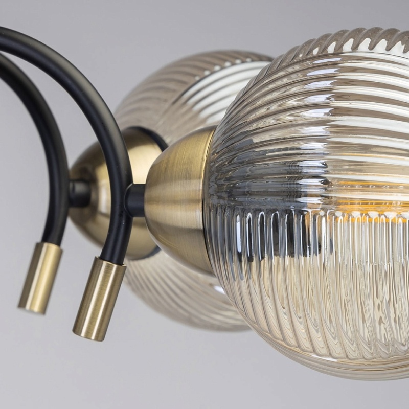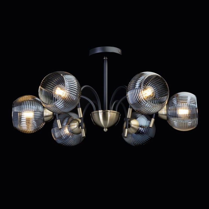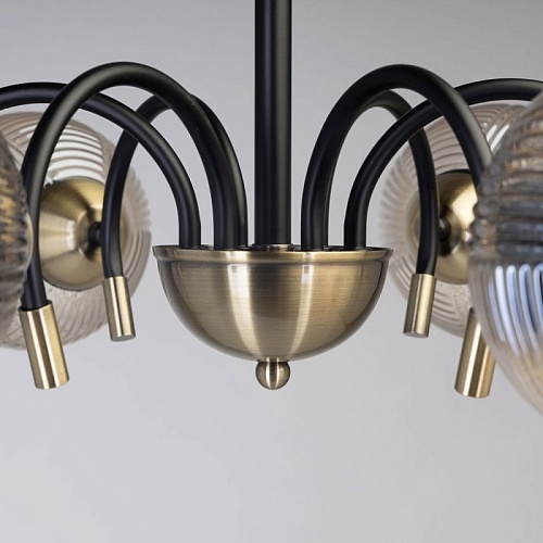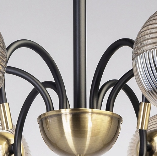 Металлическое основание подвесной люстры окрашено в черный цвет. Отдельные элементы основания гальванизированы в цвет античной бронзы. Светильник декорирован стеклянными фактурными плафонами цвета шампань.