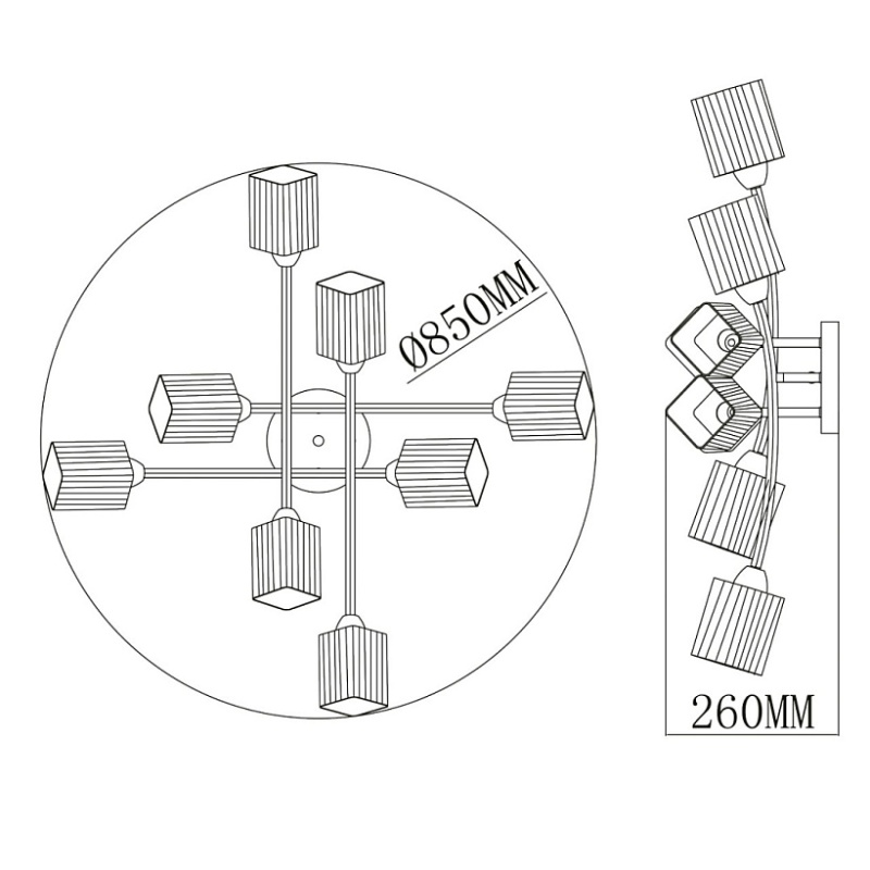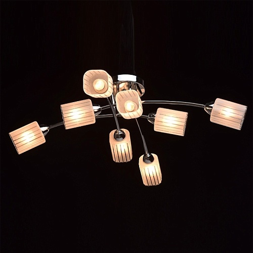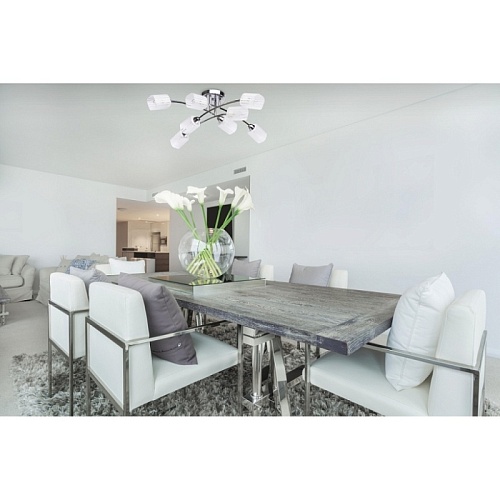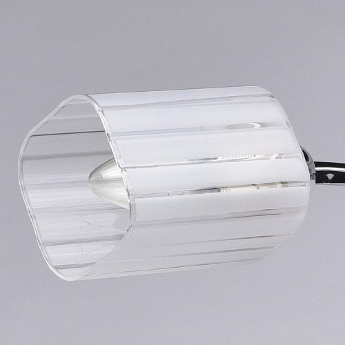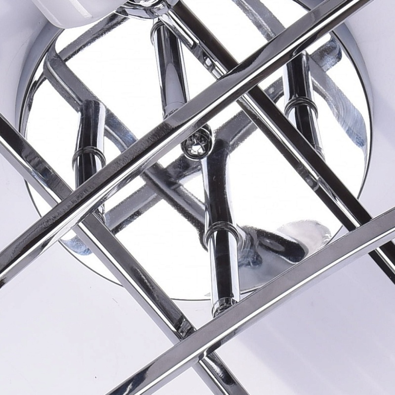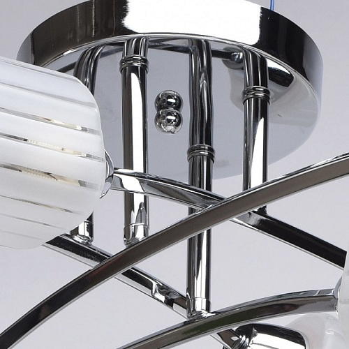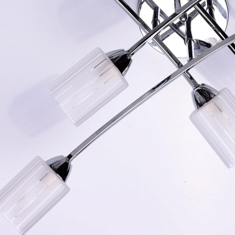 Основание светильника выполнено из металла и гальванизировано в цвет хрома. Потолочная чаша и держатели плафонов изготовлены по технологии обработки на токарном станке.Плафоны: стекло, отлито в форму. Плафоны матированы по трафарету.