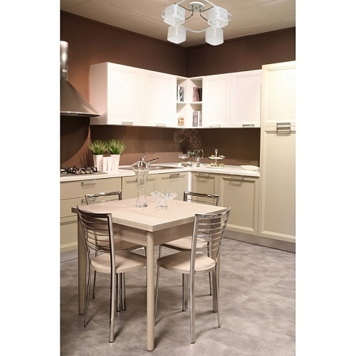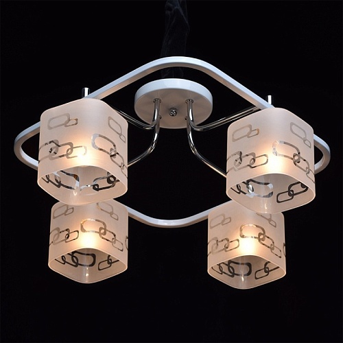 Арматура светильника выполнена из сплава железа. Рожки гальванизированы в цвет хрома. Основание и декоративный квадратный элемент окрашены в белый глянцевый цвет. Светильник декорирован стеклянными плафонами, обработанными по технологии пескоструйного матирования по шаблону. Края плафонов обработаны по технологии оплавления.