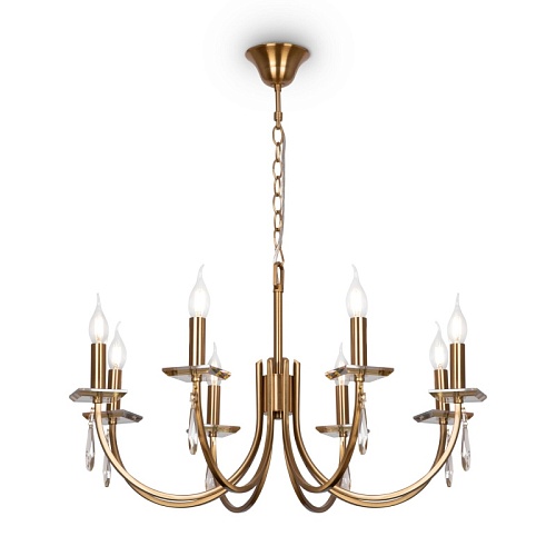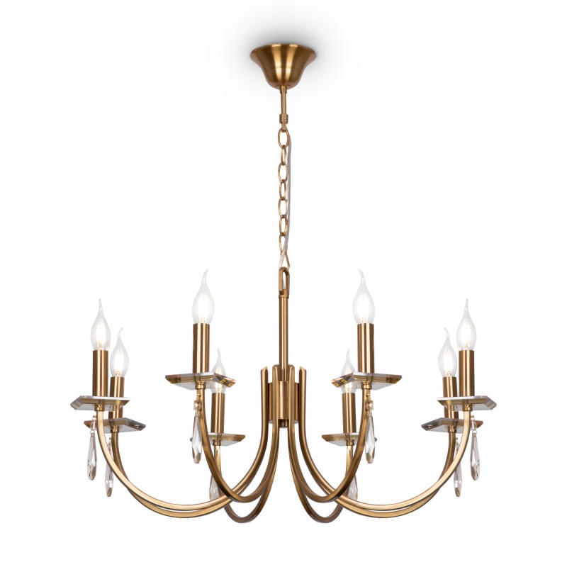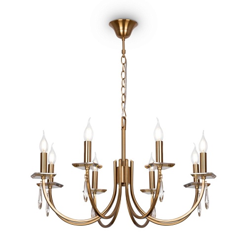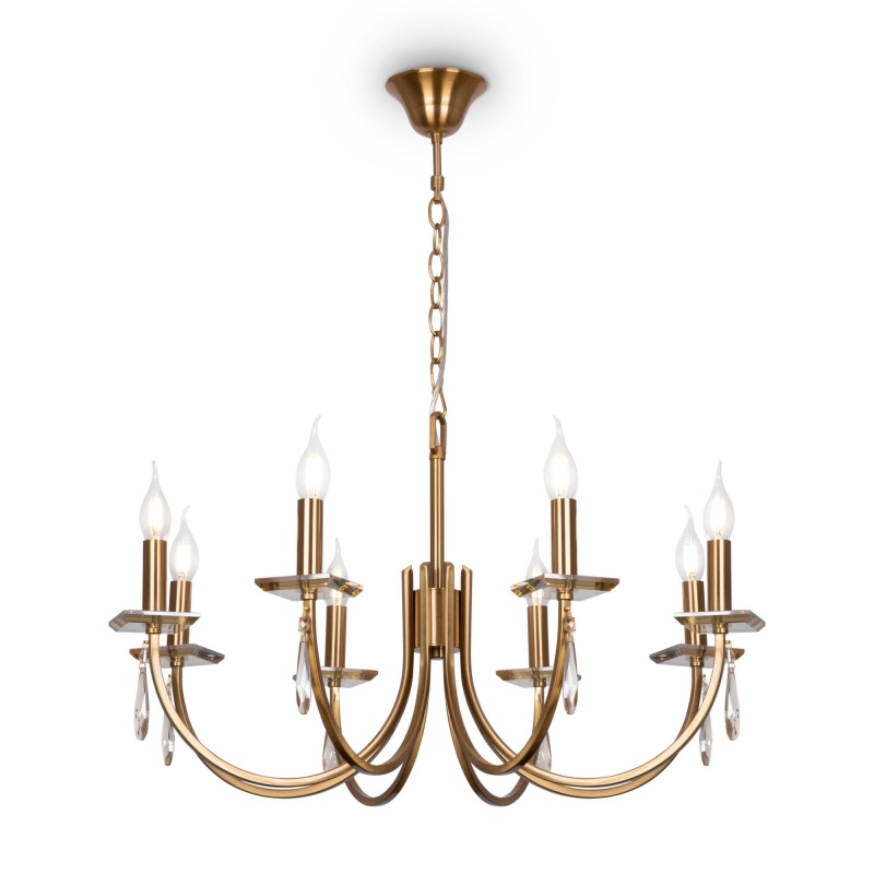 Металлическая арматура в двух оттенках: латунь и никель. Классическая форма плафона в виде свечи. Торшер и настольная лампа имеют тканевые абажуры. Белые – для арматуры цвета никель, оттенка кремовый шампань – для латунной. Декор – прозрачные хрустальные подвесы каплевидной формы. Торшер с цоколем Е27, лампа, бра и люстры – Е14.