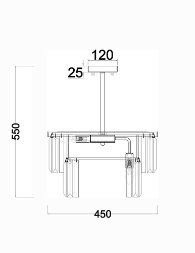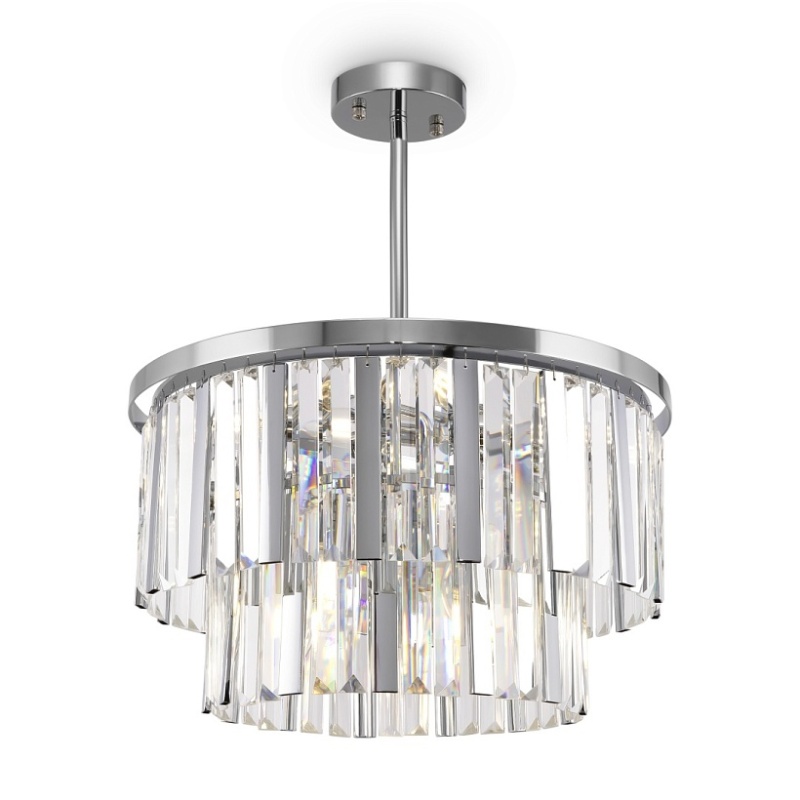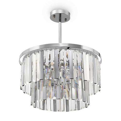 Арматура из металла. Оттенки – хром, золото. Многоярусный стеклянный декор прямоугольной вытянутой формы. В качестве источников света используются лампы с цоколем Е14.