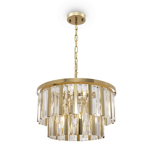Арматура из металла. Оттенки – хром, золото. Многоярусный стеклянный декор прямоугольной вытянутой формы. В качестве источников света используются лампы с цоколем Е14.