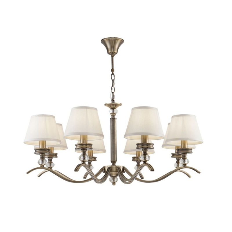 Элегантные светильники в классическом стиле. Металлическая арматура светильников Alessandra цвета латуни сочетается с кремовым цветом абажуров из ткани. Абажуры окантованы лентой в тон. Дизайн арматуры дополнен декоративным элементом из стекла.