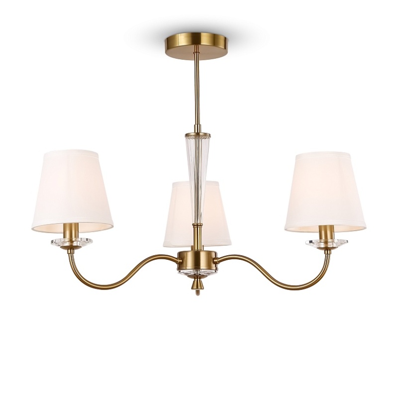 Металлическая арматура в двух оттенках на выбор: латунь и никель. Абажуры – текстиль белого цвета. Декоративные элементы из прозрачного стекла. Источник света – лампа с цоколем E14.