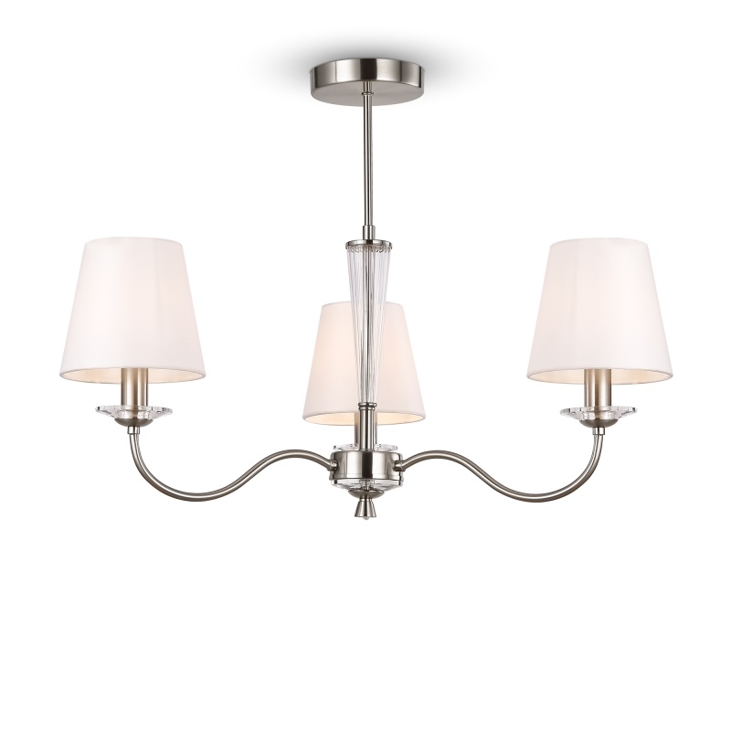 Металлическая арматура в двух оттенках на выбор: латунь и никель. Абажуры – текстиль белого цвета. Декоративные элементы из прозрачного стекла. Источник света – лампа с цоколем E14.