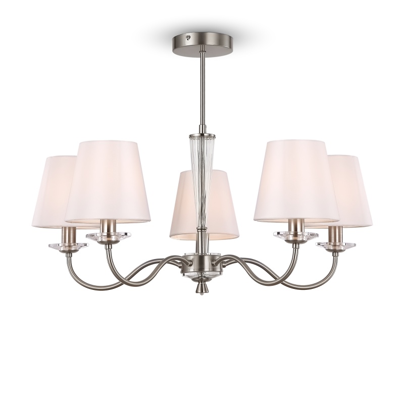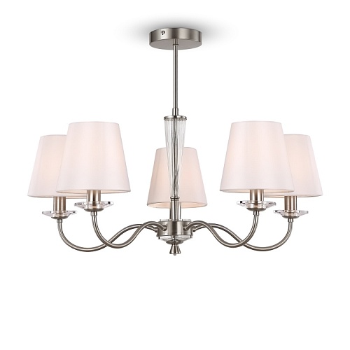 Металлическая арматура в двух оттенках на выбор: латунь и никель. Абажуры – текстиль белого цвета. Декоративные элементы из прозрачного стекла. Источник света – лампа с цоколем E14.