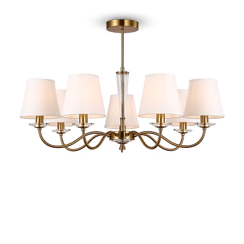 Металлическая арматура в двух оттенках на выбор: латунь и никель. Абажуры – текстиль белого цвета. Декоративные элементы из прозрачного стекла. Источник света – лампа с цоколем E14.