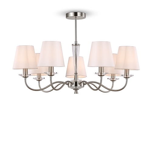Металлическая арматура в двух оттенках на выбор: латунь и никель. Абажуры – текстиль белого цвета. Декоративные элементы из прозрачного стекла. Источник света – лампа с цоколем E14.