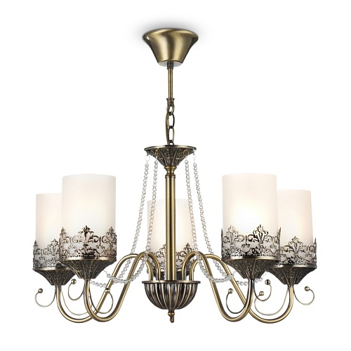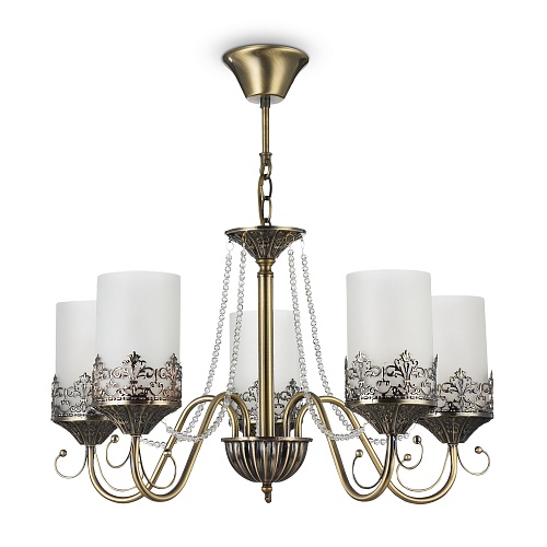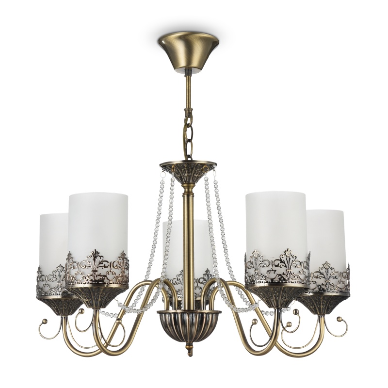 Нарядные и стильные светильники – прекрасное решение для интерьеров в современном стиле. Металлическая арматура окрашена в бронзовый цвет, плафоны из матового стекла в виде "свечек". Основание изделий и розетки украшены объемным орнаментом. Также светильники дополнены подвесками.