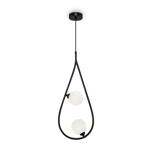 Металлическая арматура в черном цвете. Плафоны формы шар из матового белого стекла. Оригинальный силуэт арматуры с «нанизанными» плафонами. Удлиненный кабель для помещений с высокими потолками. Источник света – лампа G9.