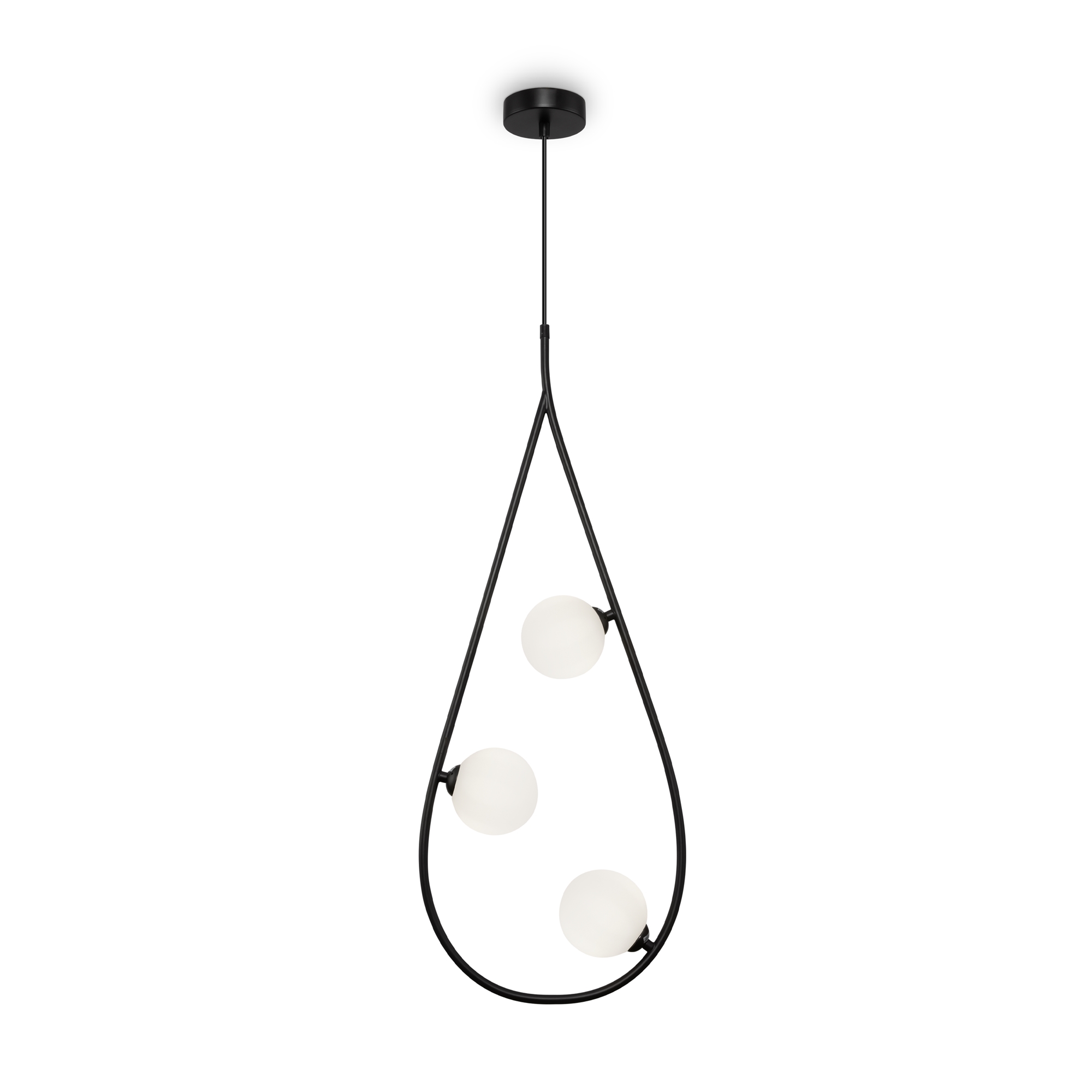 Металлическая арматура в черном цвете. Плафоны формы шар из матового белого стекла. Оригинальный силуэт арматуры с «нанизанными» плафонами. Удлиненный кабель для помещений с высокими потолками. Источник света – лампа G9.