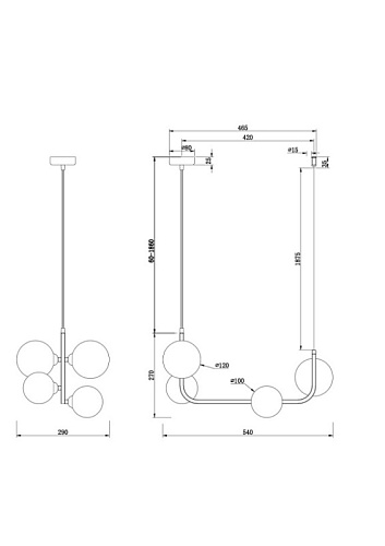 Металлическая арматура в черном цвете. Плафоны формы шар из матового белого стекла. Оригинальный силуэт арматуры с «нанизанными» плафонами. Удлиненный кабель для помещений с высокими потолками. Источник света – лампа G9.
