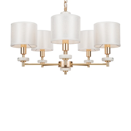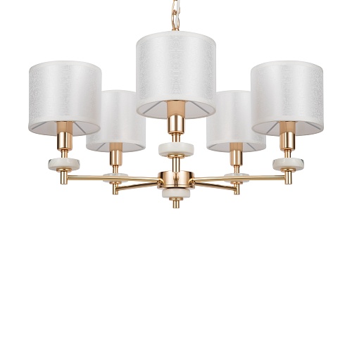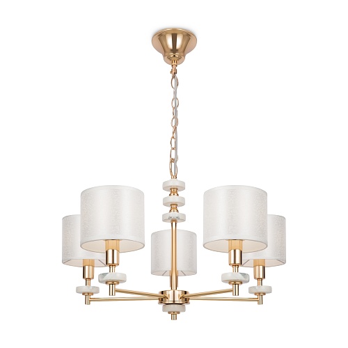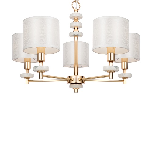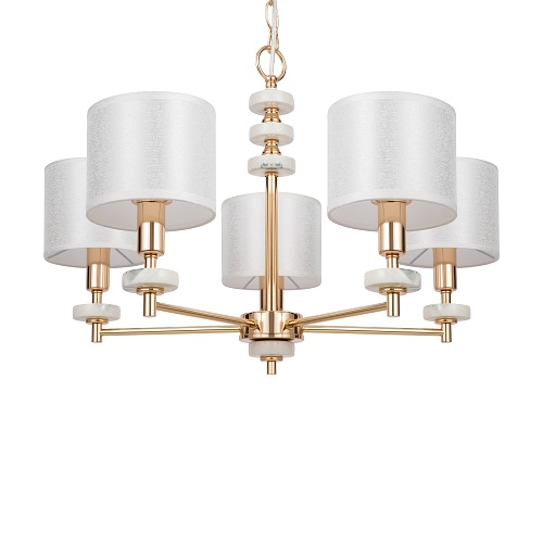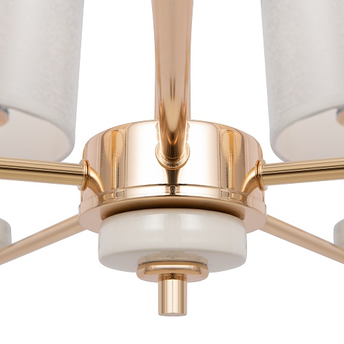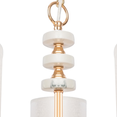 Металлическая арматура золотого оттенка. Абажуры – текстиль на ПВХ кремового цвета. Трендовый керамический декор с имитацией мрамора. Источник света – лампа с цоколем E14.