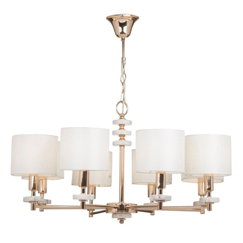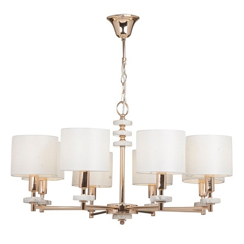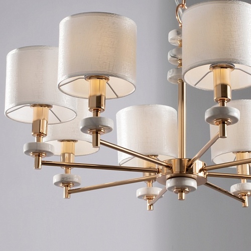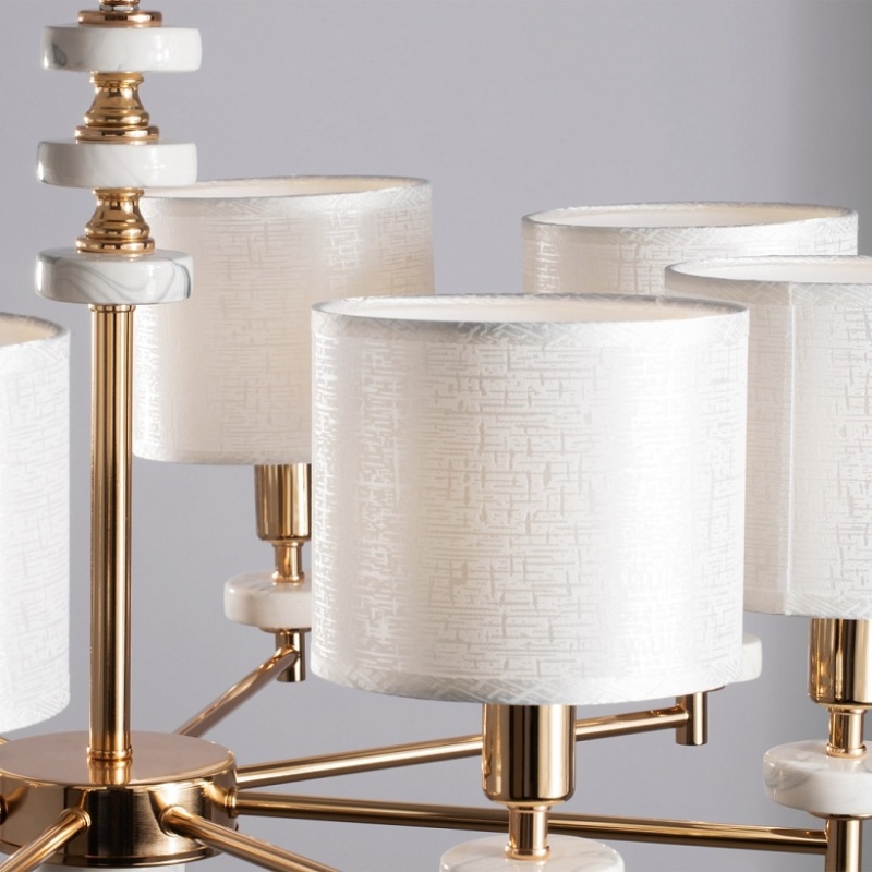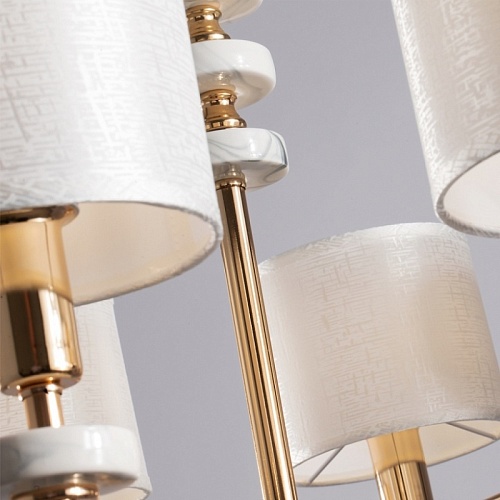 Металлическая арматура золотого оттенка. Абажуры – текстиль на ПВХ кремового цвета. Трендовый керамический декор с имитацией мрамора. Источник света – лампа с цоколем E14.