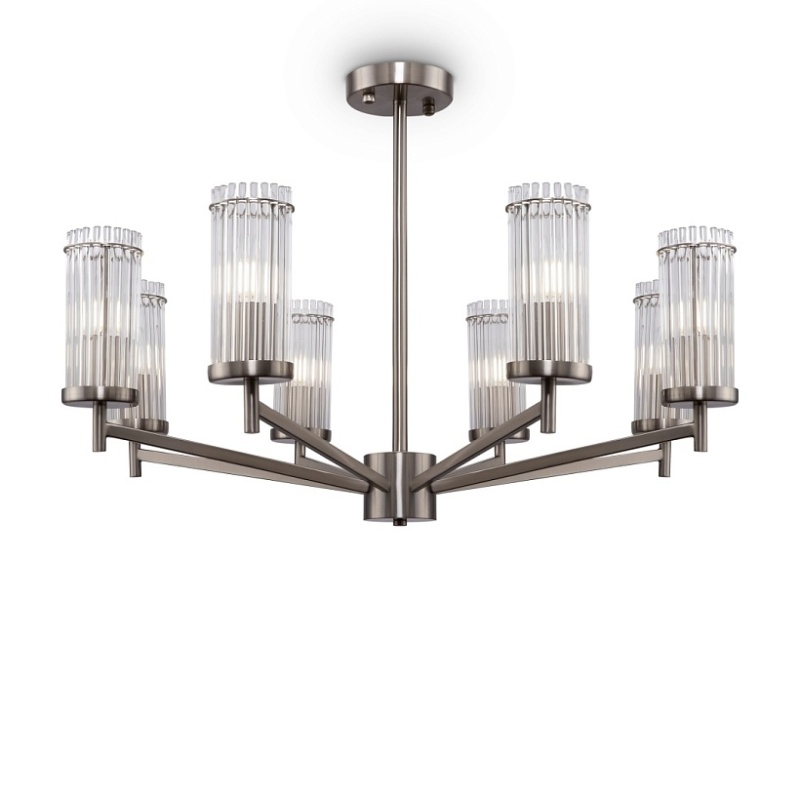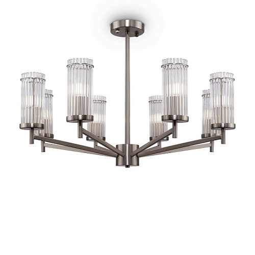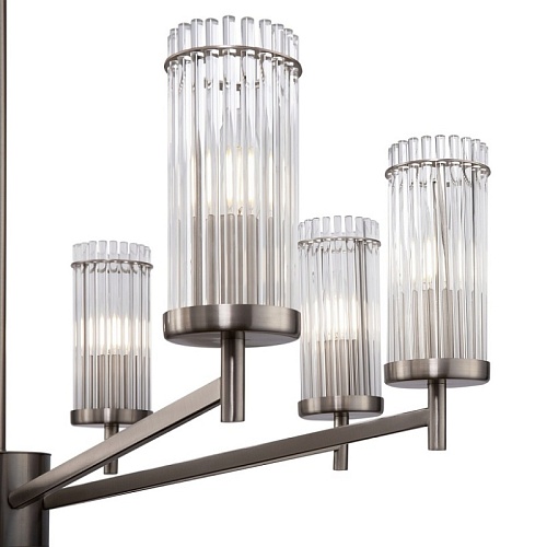 Арматура из металла. Цвет – никель. Плафоны цилиндрической формы выполнены из прозрачных стеклянных трубок. Атмосферная игра света в фактурных гранях. Источник света – лампа с цоколем Е14.