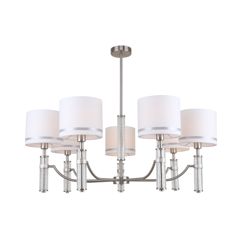 Эстетика неоклассицизма объединила светильники серии Albero – люстру на 7/5 ламп, бра и настольную лампу. Металлическая арматура цвета никеля подчеркнута оригинальным цилиндрическим декором из рельефного стекла – за счёт этого создается ощущение невесомости и легкости конструкции. Кремовые тканевые абажуры, обрамленные кантом, венчают композицию, придавая ей завершенный вид и даря мягкий, слегка приглушенный свет. Регулируемый подвес позволяет настроить оптимальную высоту люстры в зависимости от параметров помещения. Широкий выбор светильников в серии дарит возможность организовать комплексное, многоуровневое освещение в единой выдержанной стилистике.