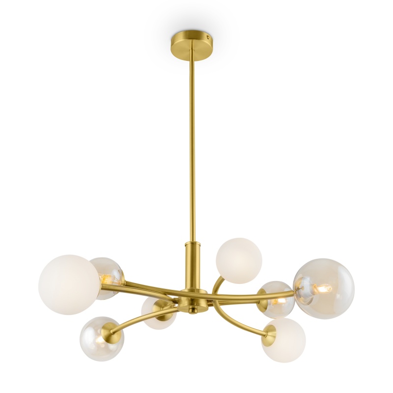 Американская классика 70-х-80-х годов всё чаще переосмысляется современным дизайном, даря нам модели «атомных» светильников. При этом, появляются новые оригинальные решения: например, плафоны двух оттенков – из белого и янтарного стекла. Необычный микс палитр разбавляет металлическая арматура цвета латуни. В серии представлены люстры различной высоты и диаметра для помещений с низкими и высокими потолками. Акцентируйте внимание на нетривиальном дизайне светильников в гостиной, спальне или кухне.