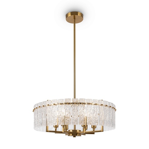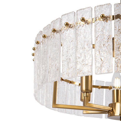 Металлическая арматура. Оттенки – латунь, никель. Декор – фактурные прямоугольные пластины. Материал декора – стекло. Подвесные светильники можно размещать на ножке и устанавливать как потолочный свет. Источник света – лампа с цоколем Е14.