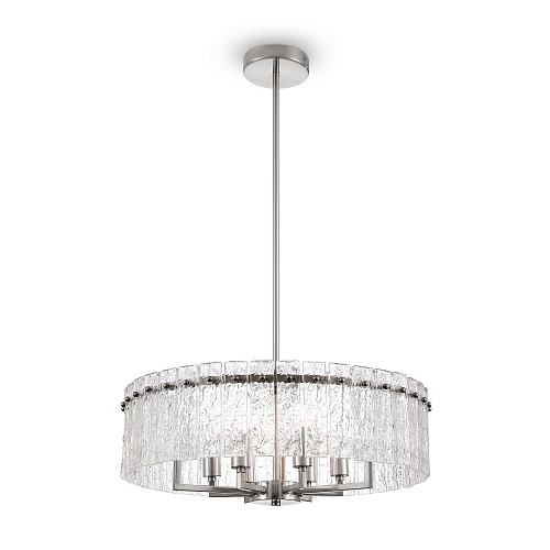 Металлическая арматура. Оттенки – латунь, никель. Декор – фактурные прямоугольные пластины. Материал декора – стекло. Подвесные светильники можно размещать на ножке и устанавливать как потолочный свет. Источник света – лампа с цоколем Е14.